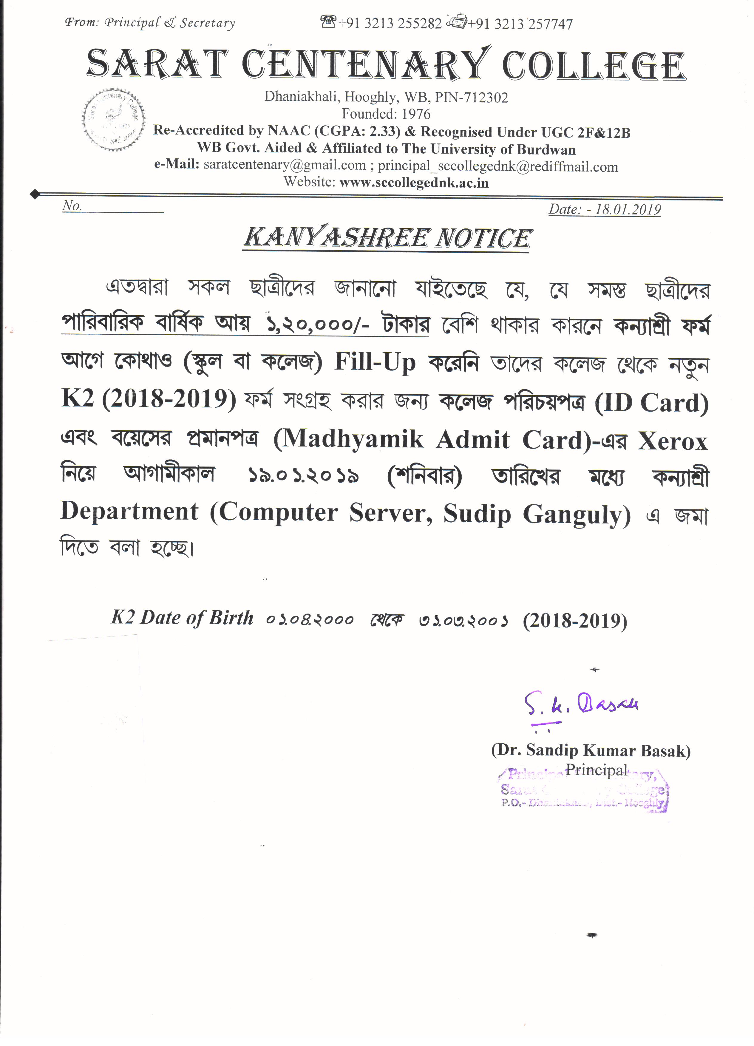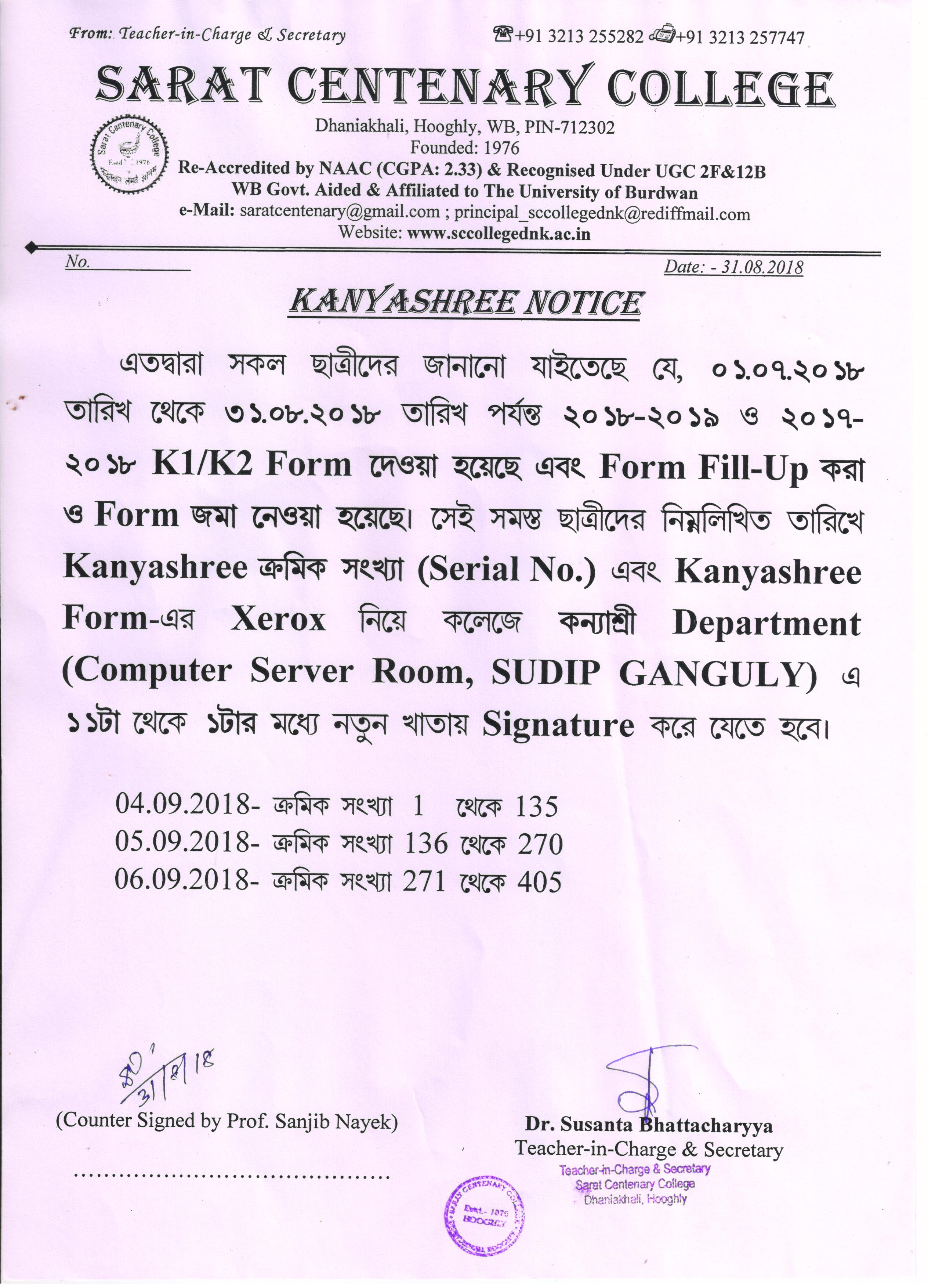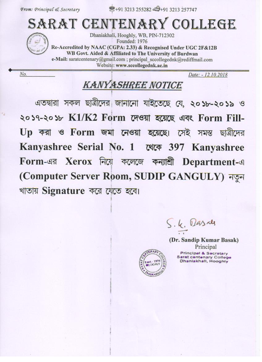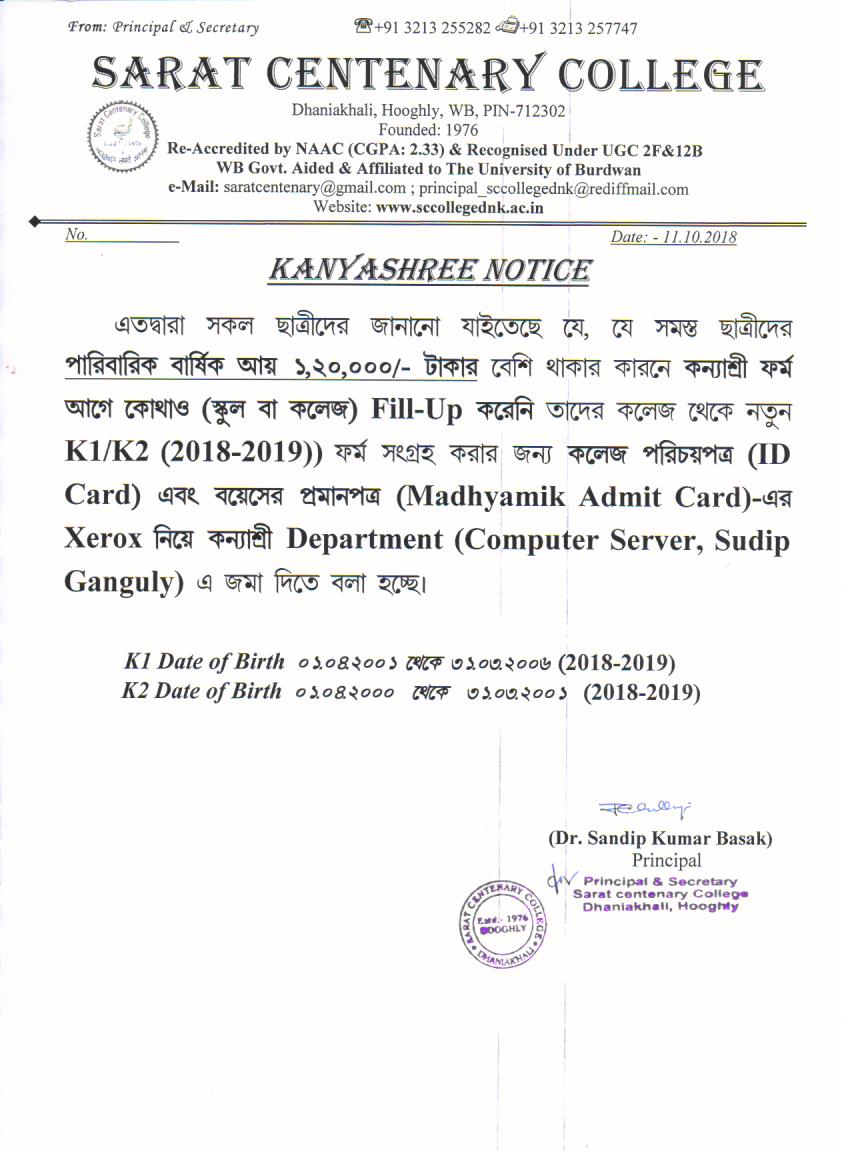 Kanyashree Notice for K2 Upgradation Form Fillup 2017-18 and Start New Session 2018-19