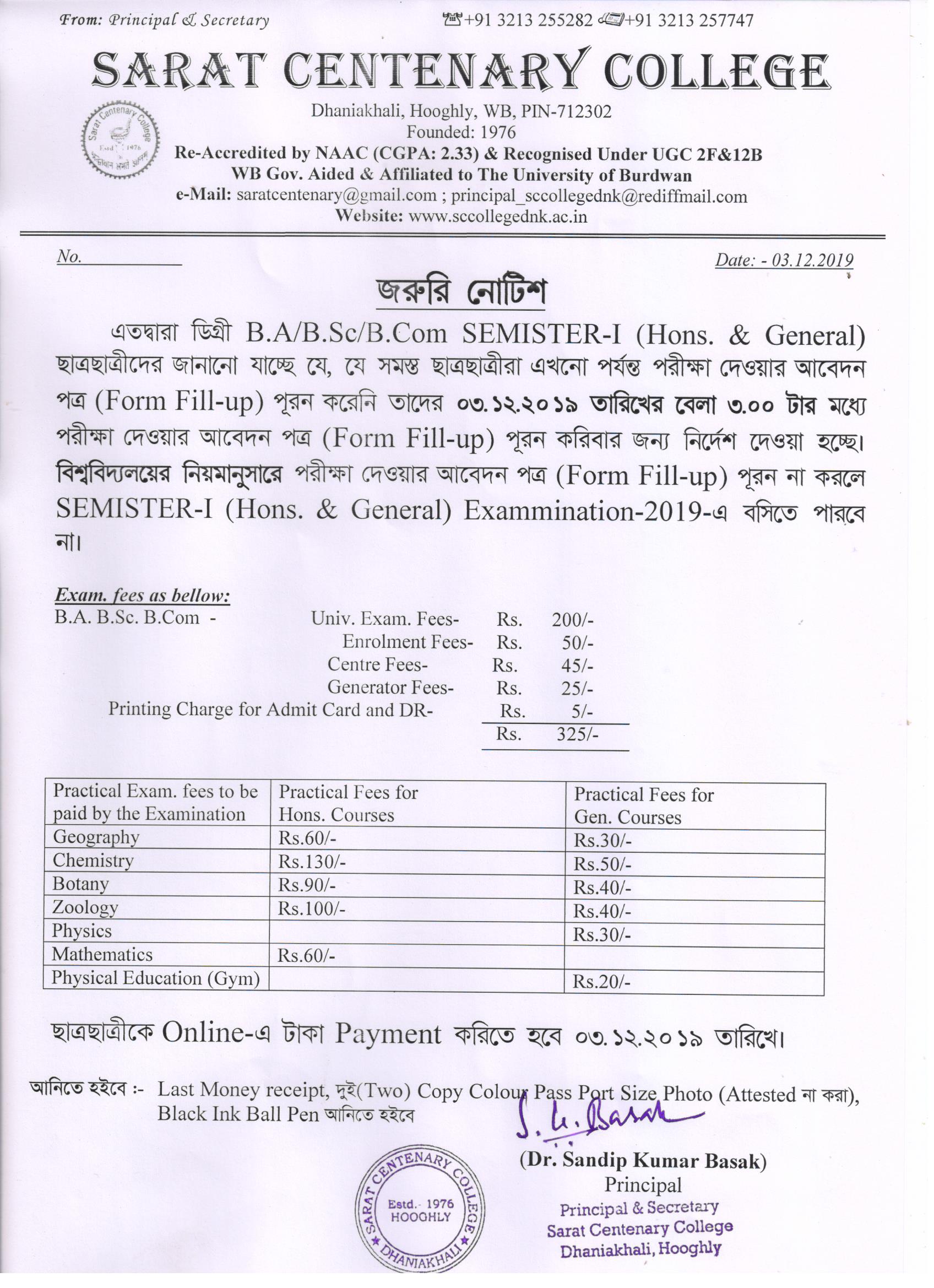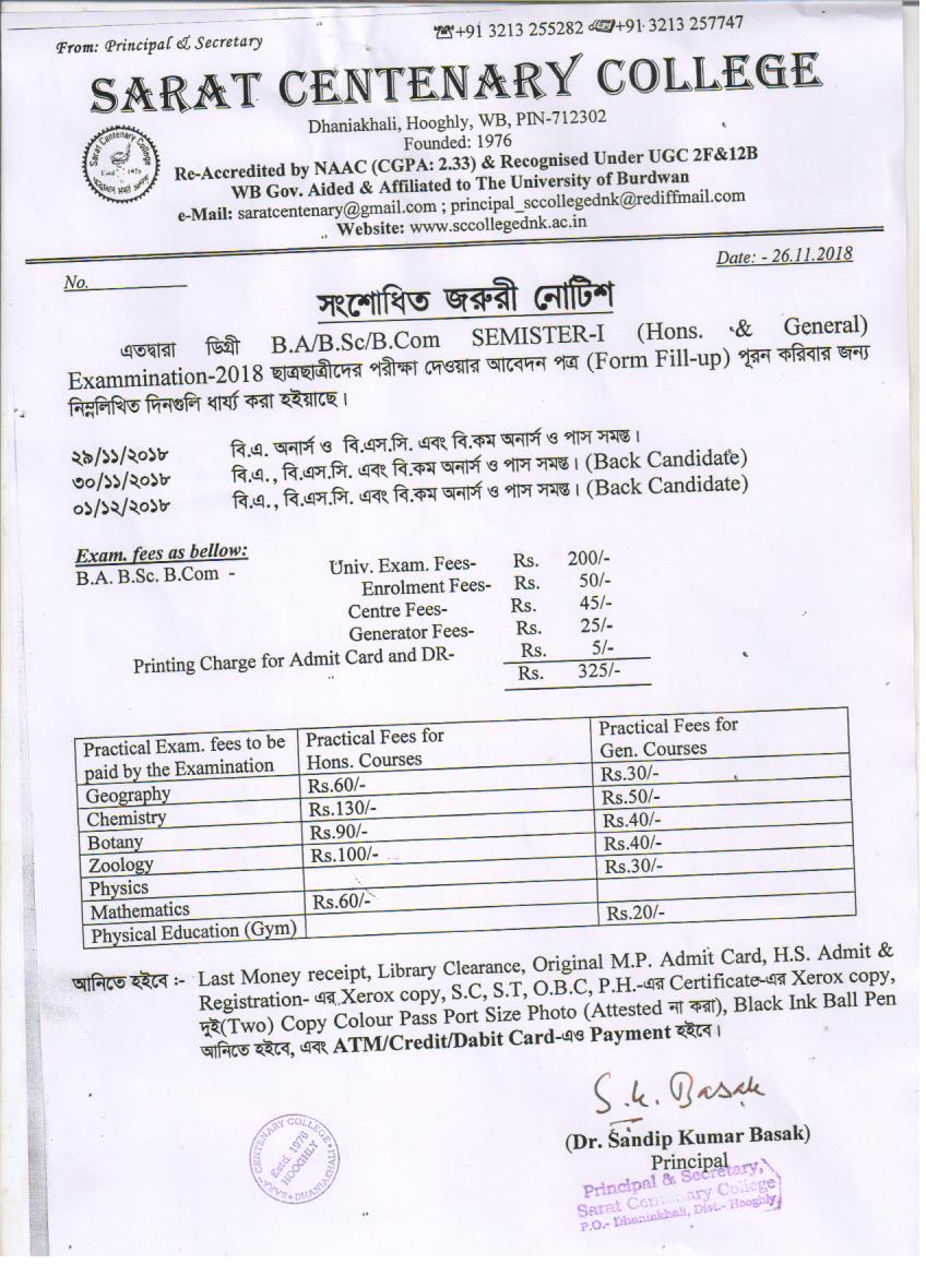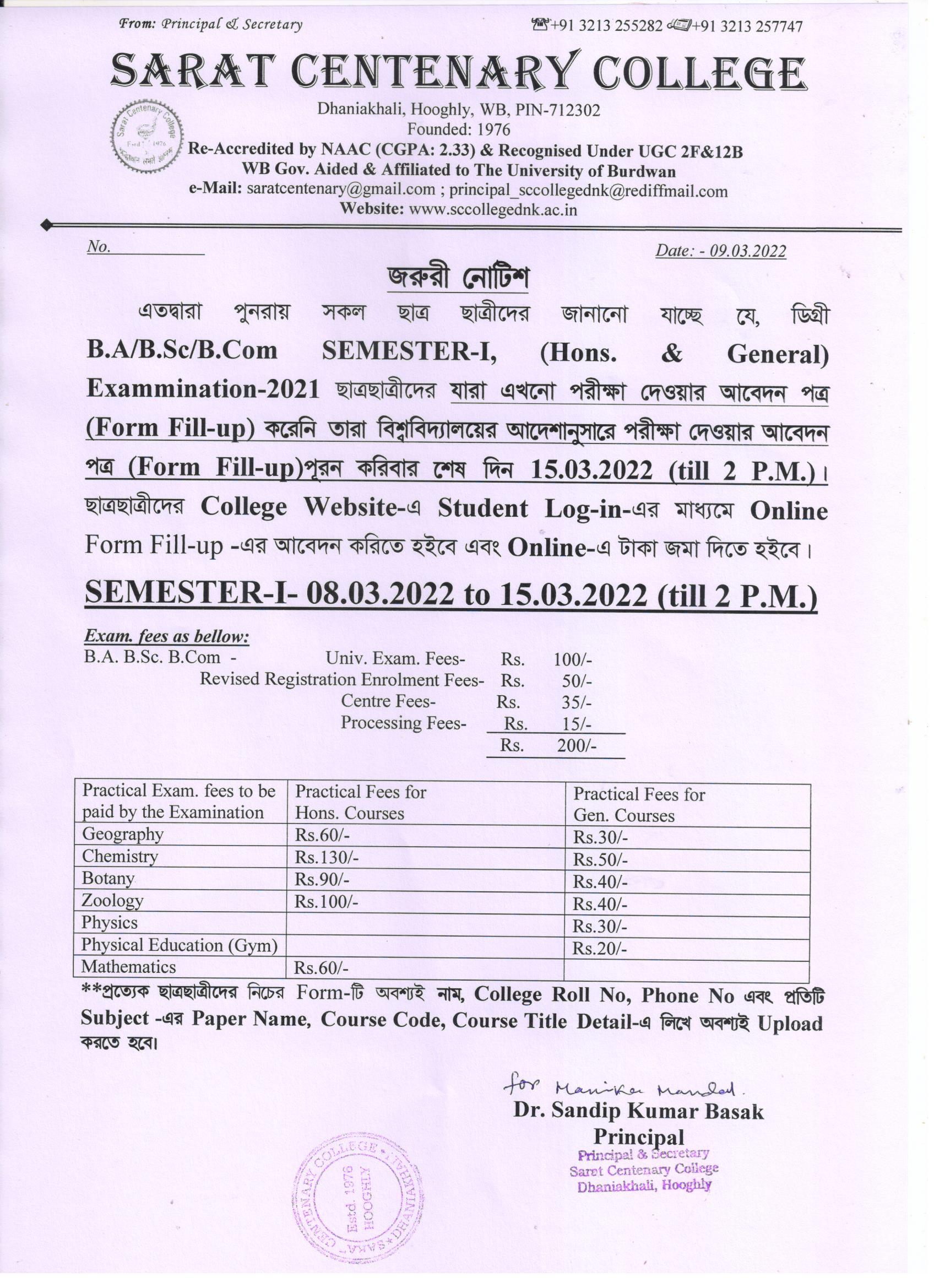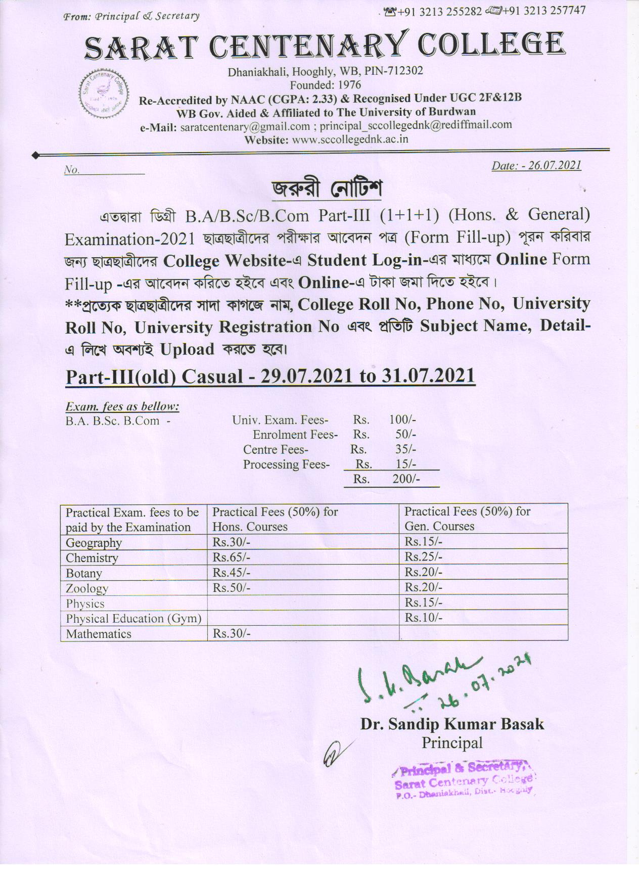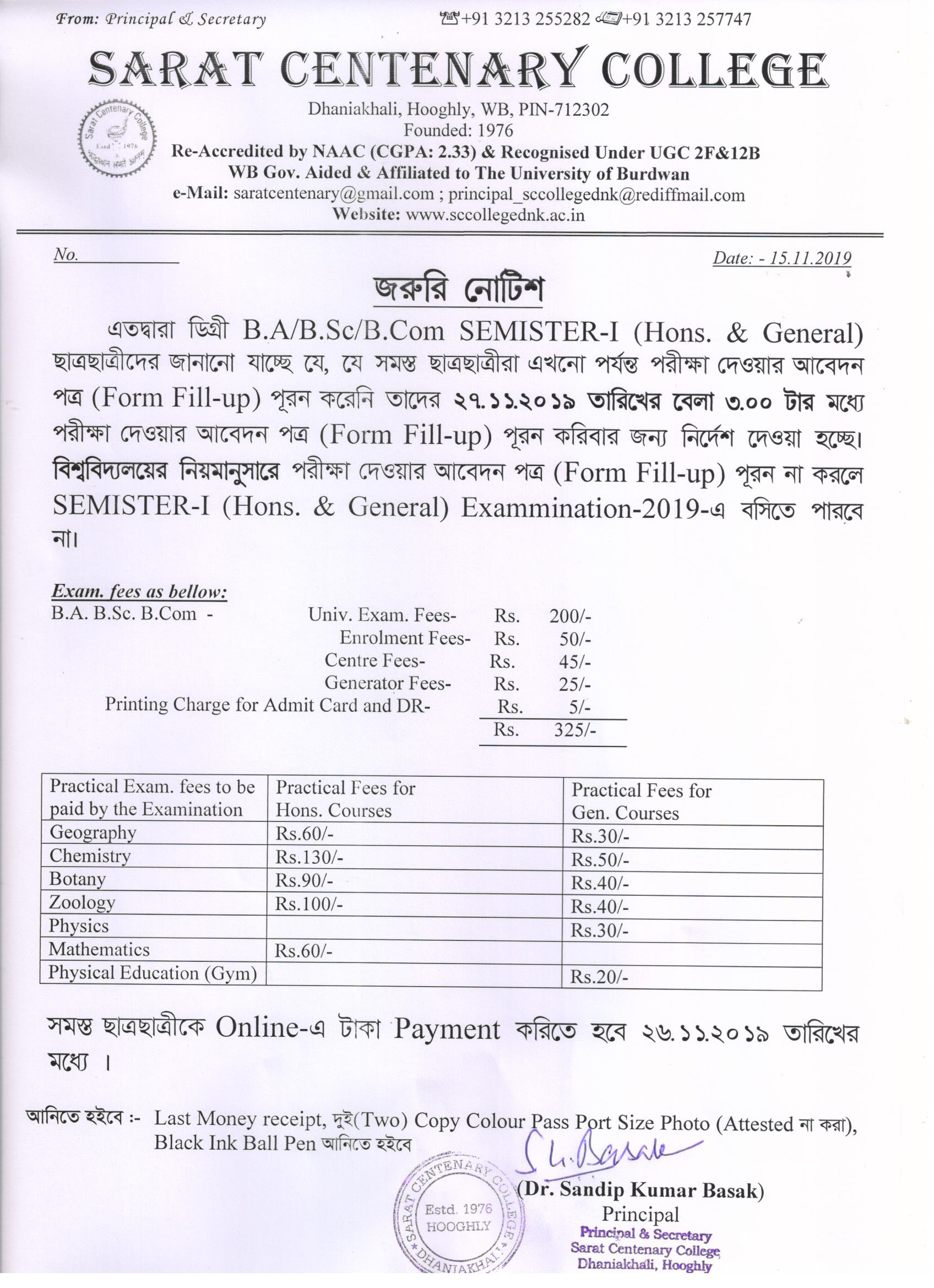 Notice for BA/ BSc/ BCom (Honours & General) Part-I (Casual) Form fill up