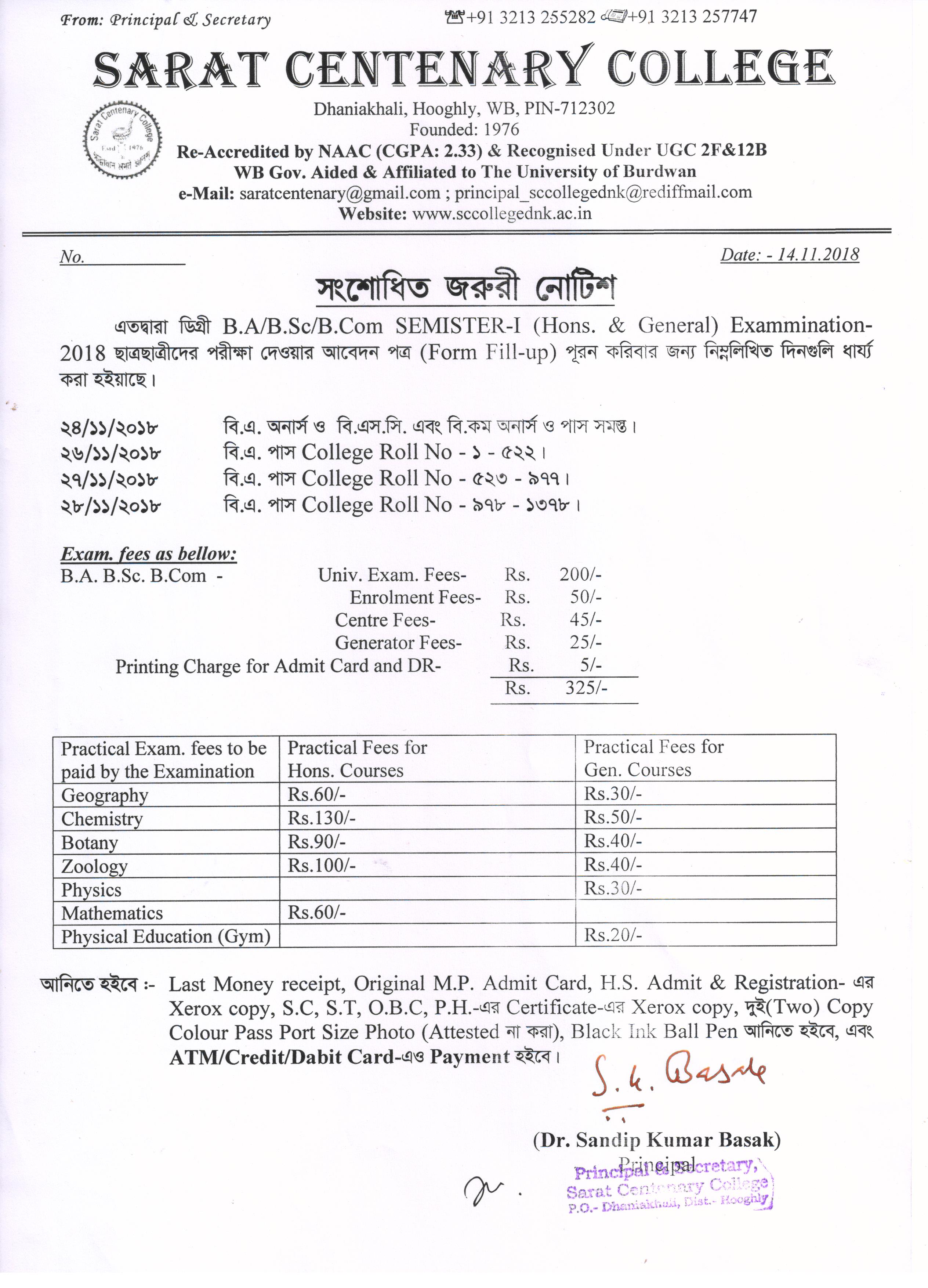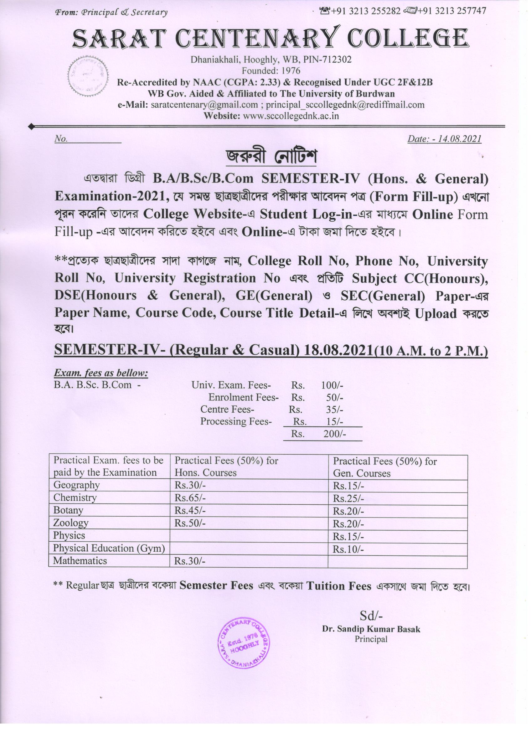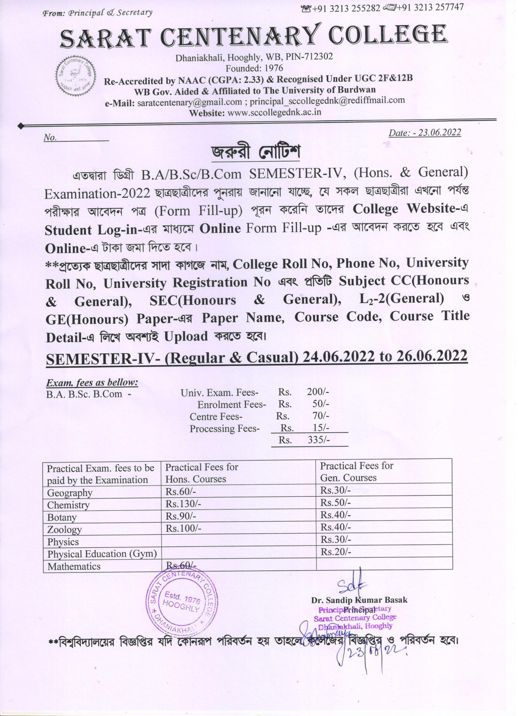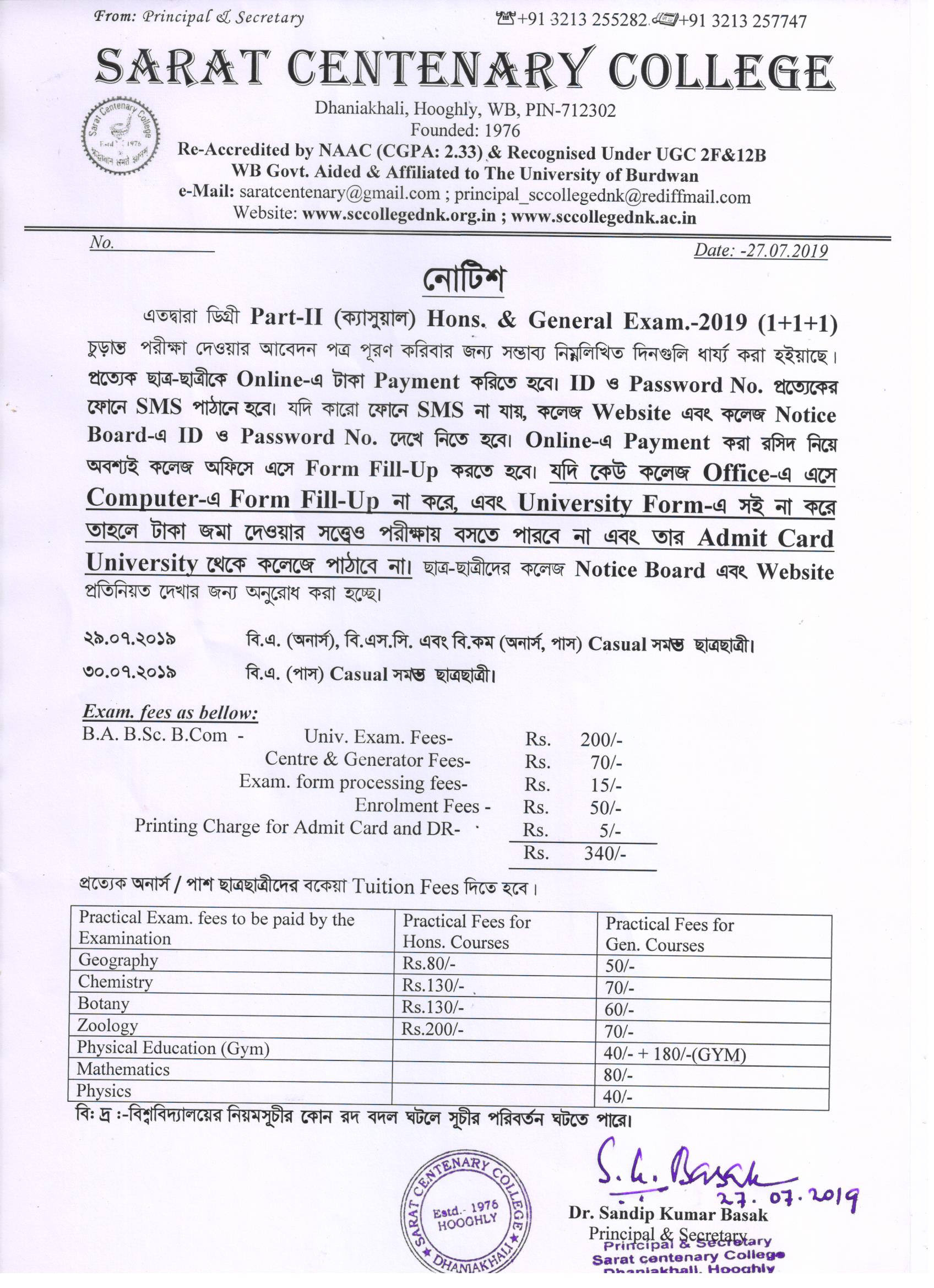 Notice for BA/ BSc/ BCom (Honours & General) Part-I (Casual) Form fill up