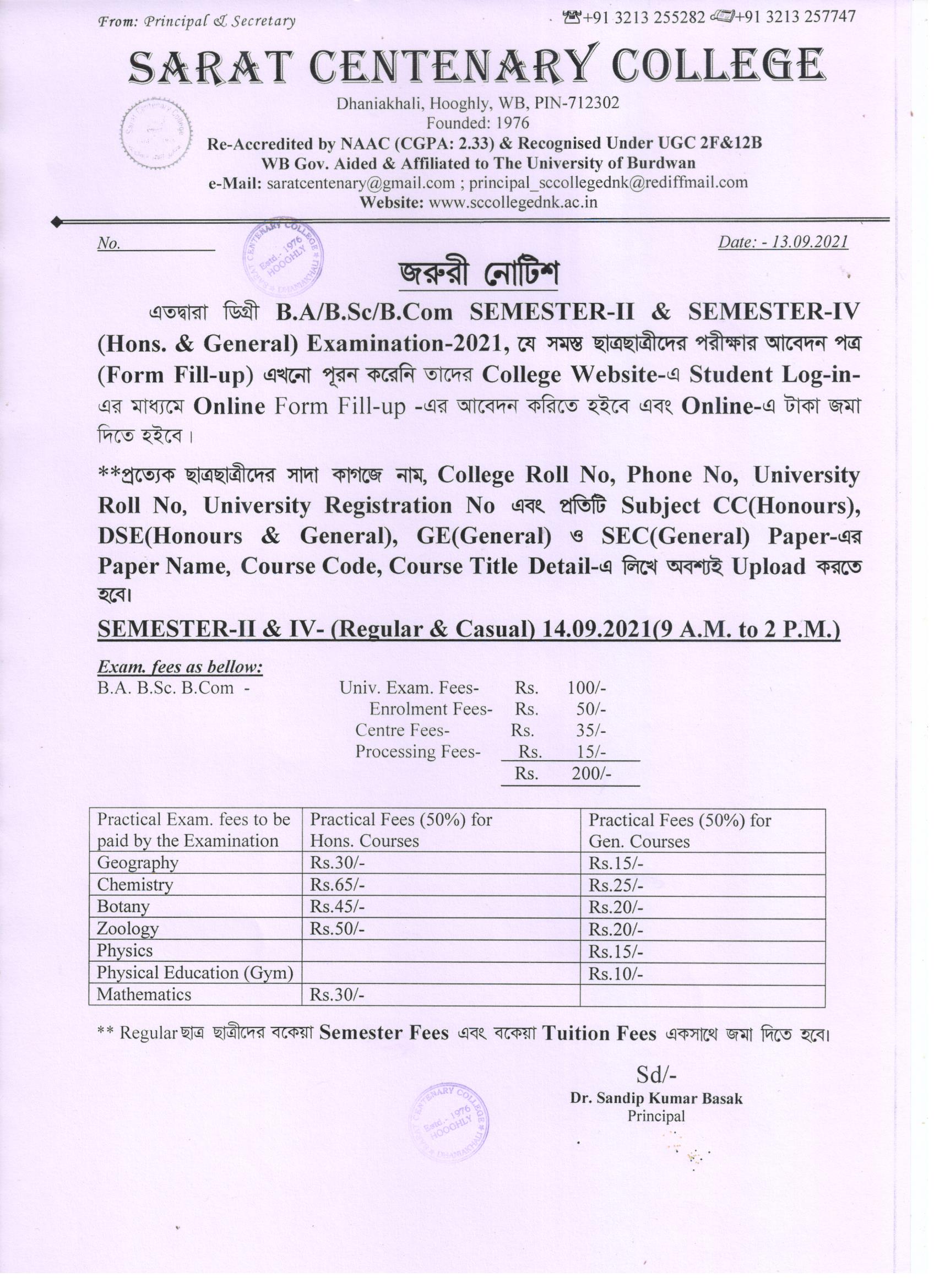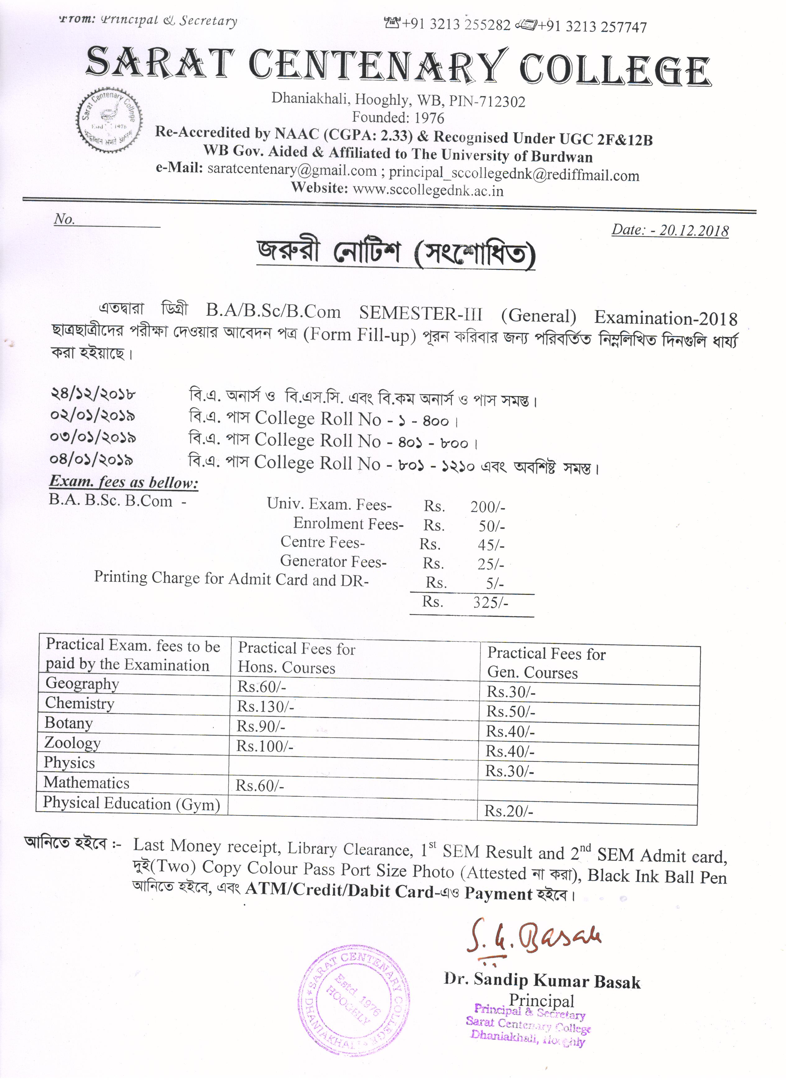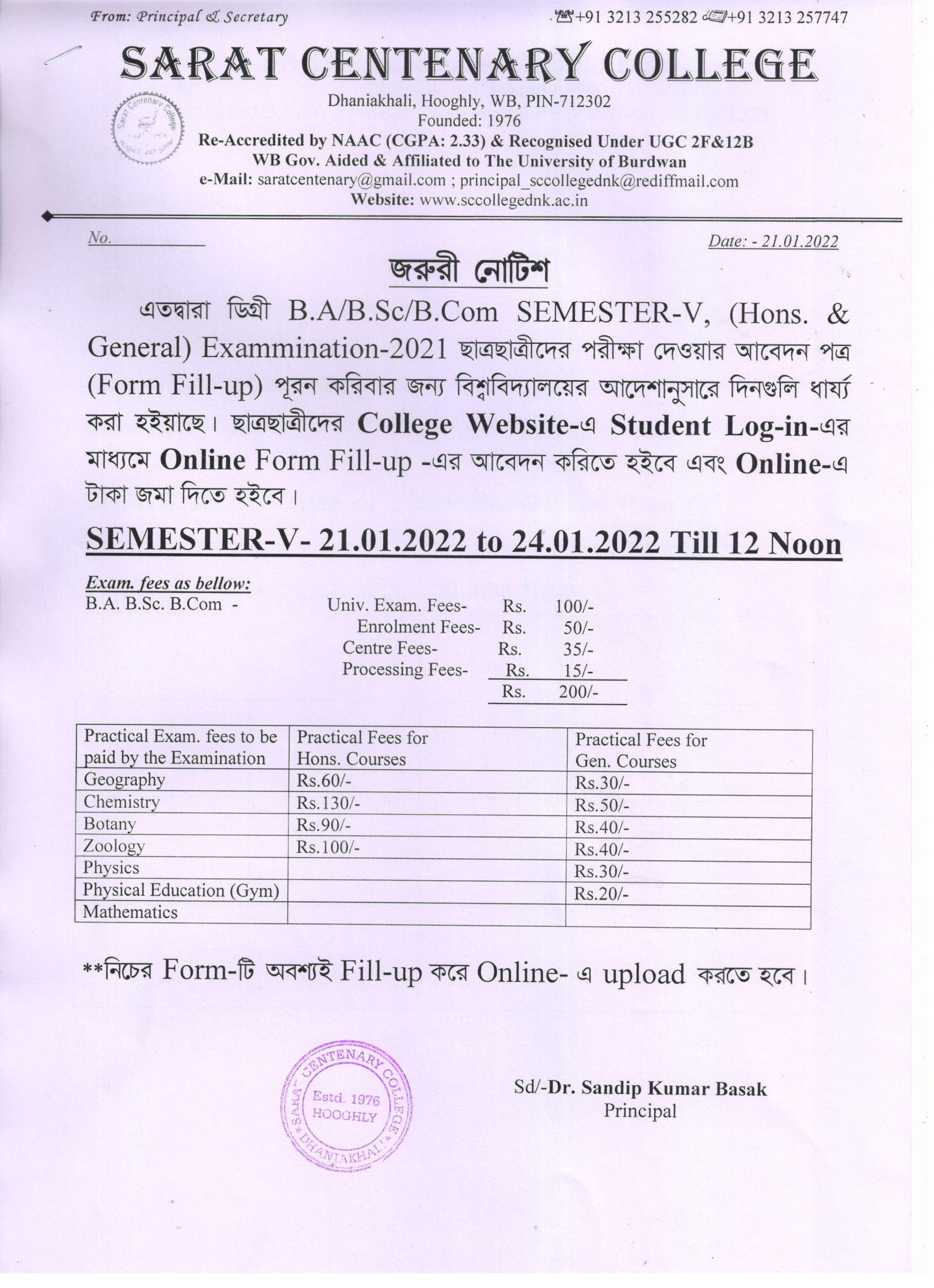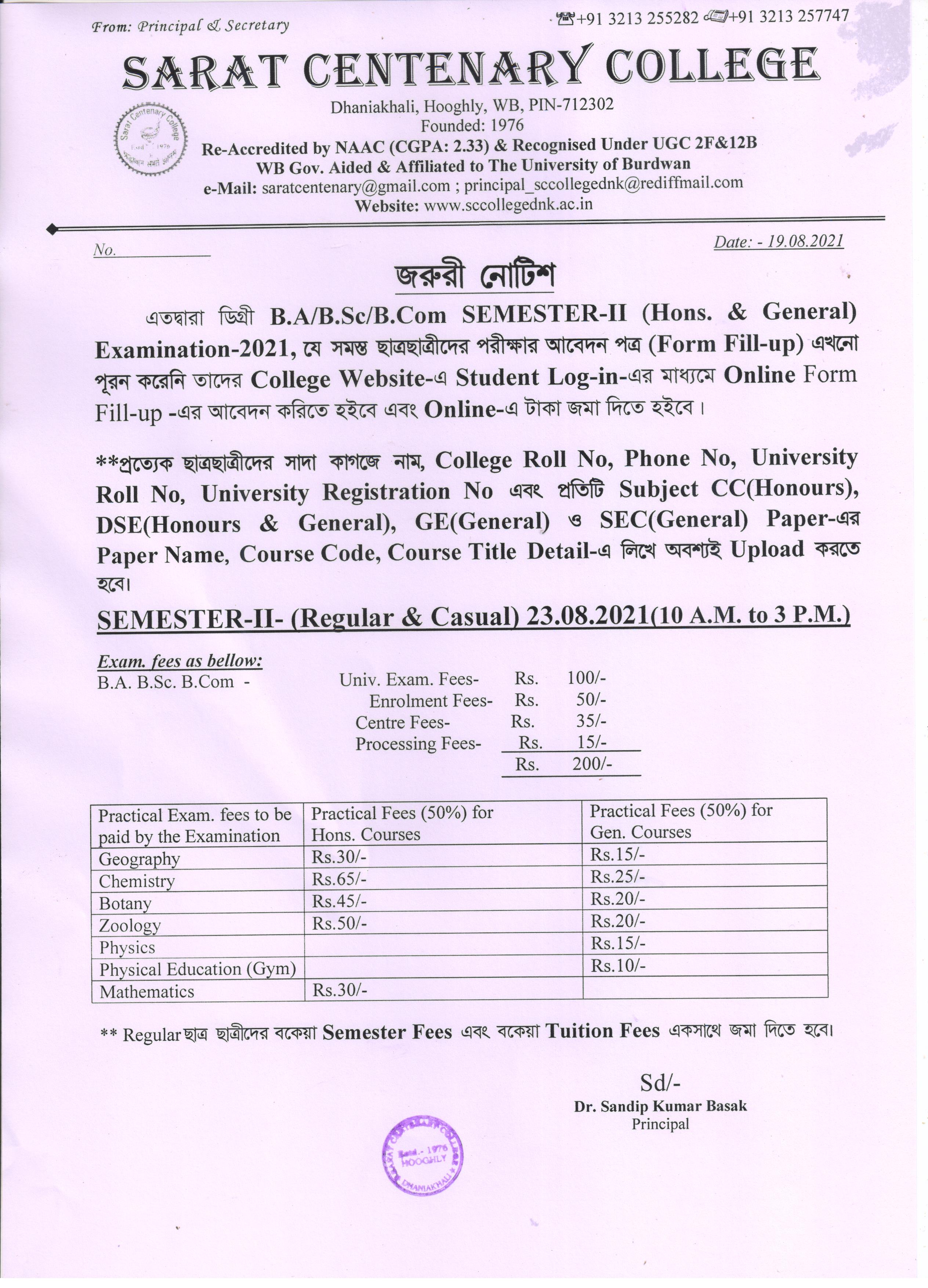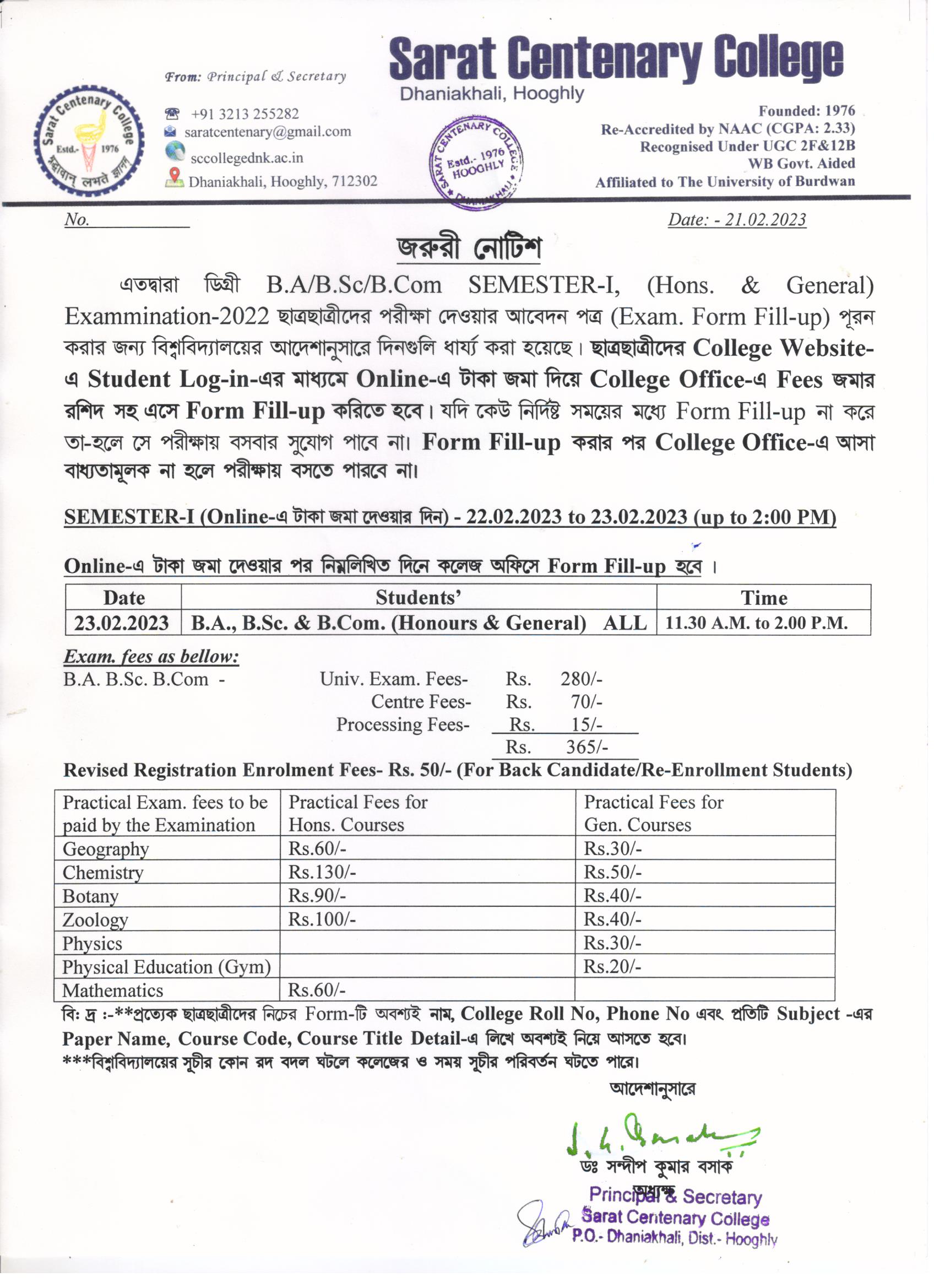 Notice for BA/ BSc/ BCom (Honours & General) Part-I (Casual) Form fill up