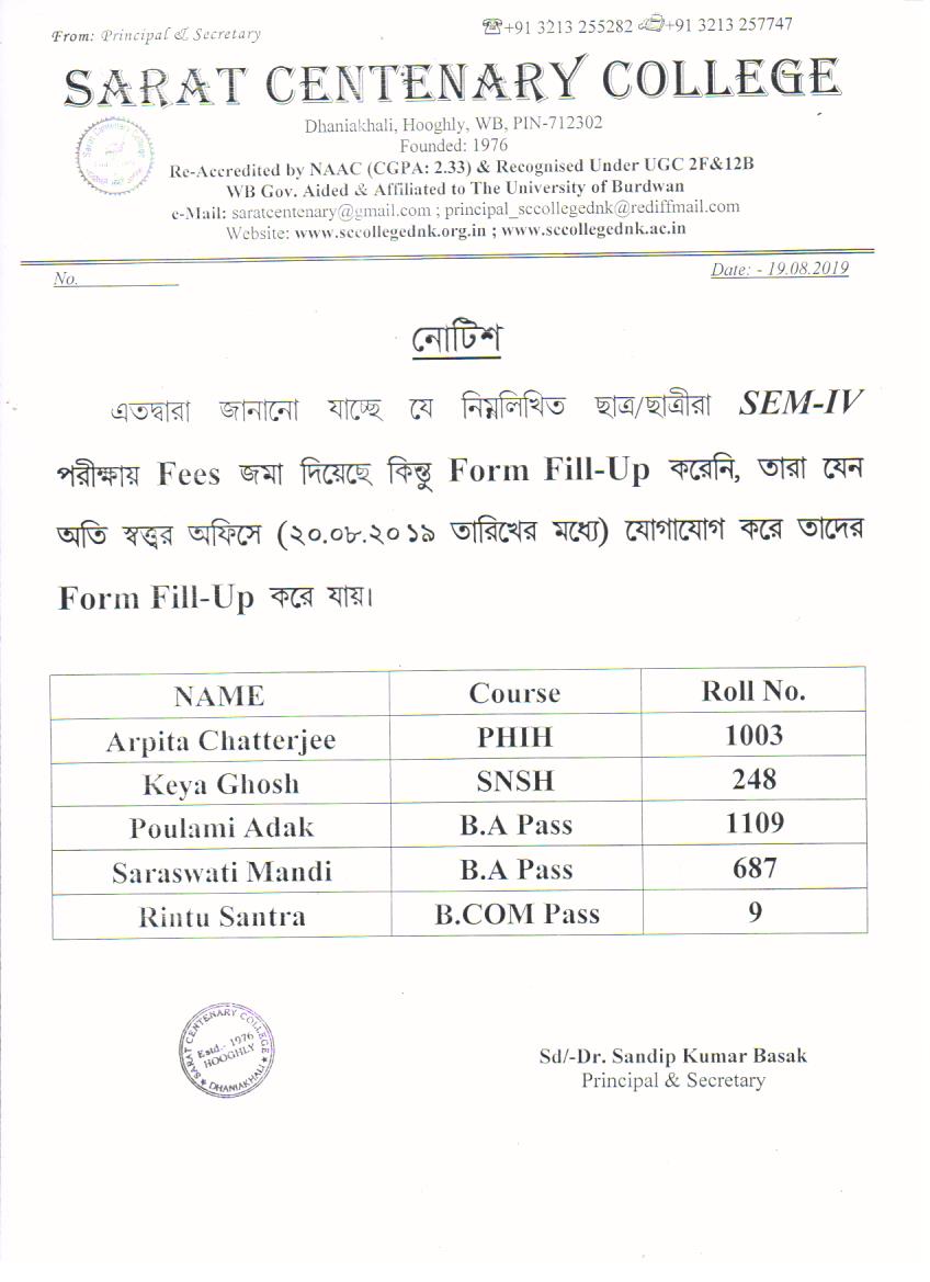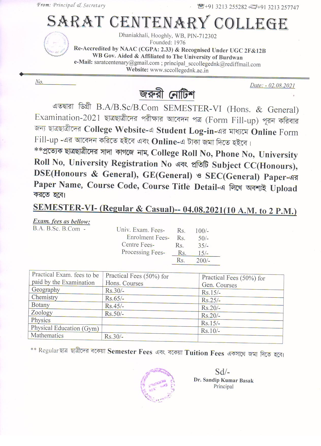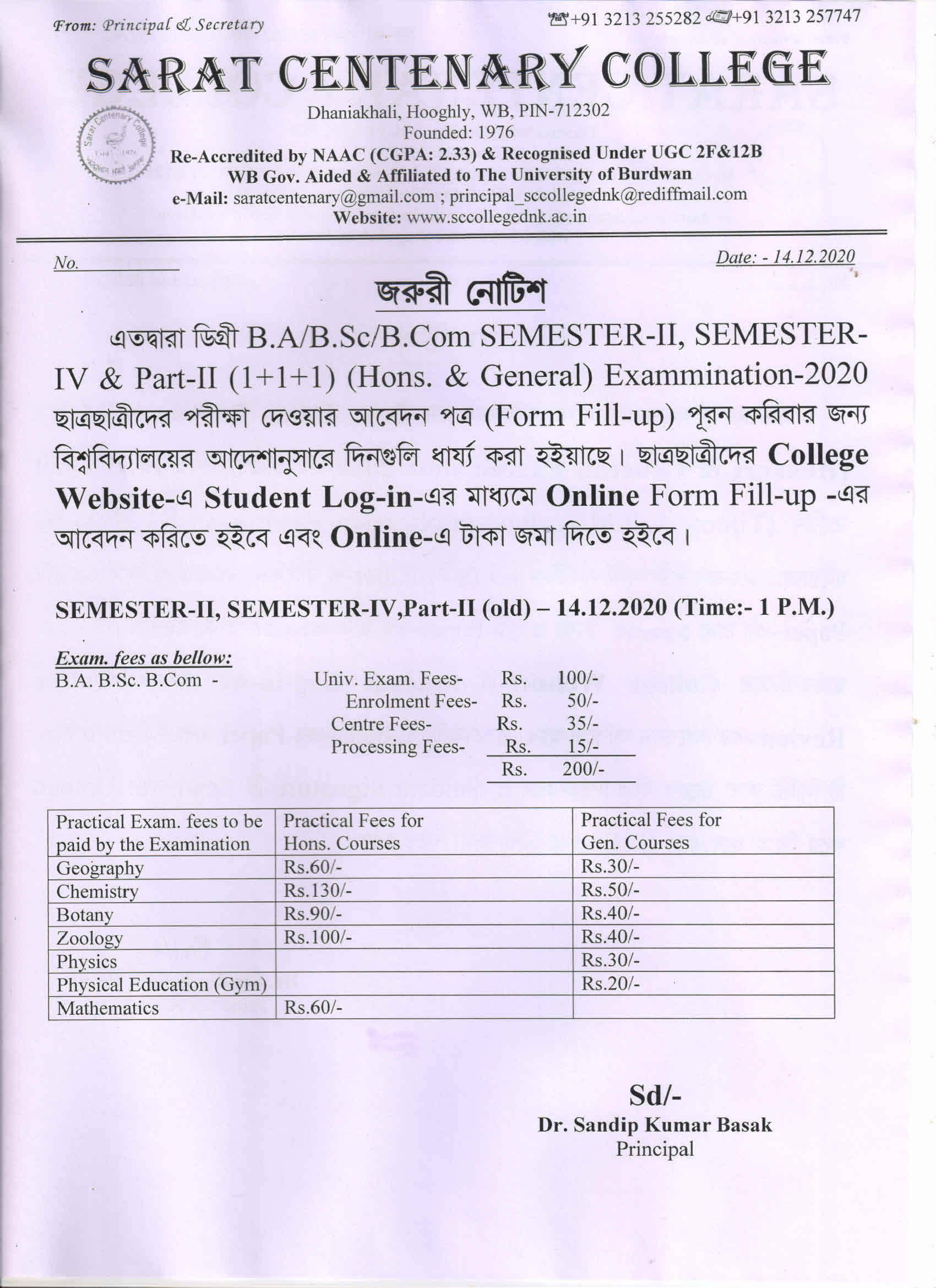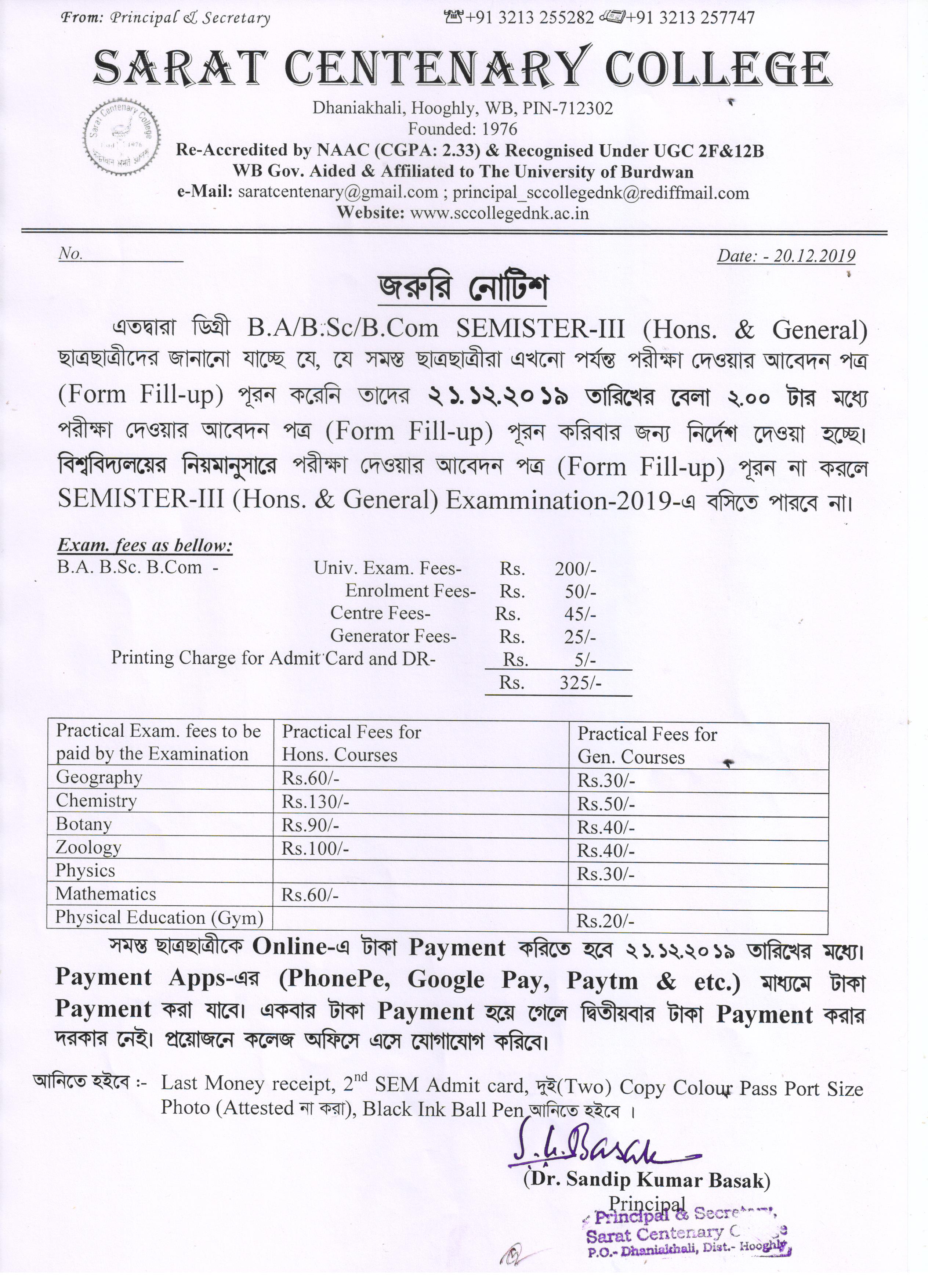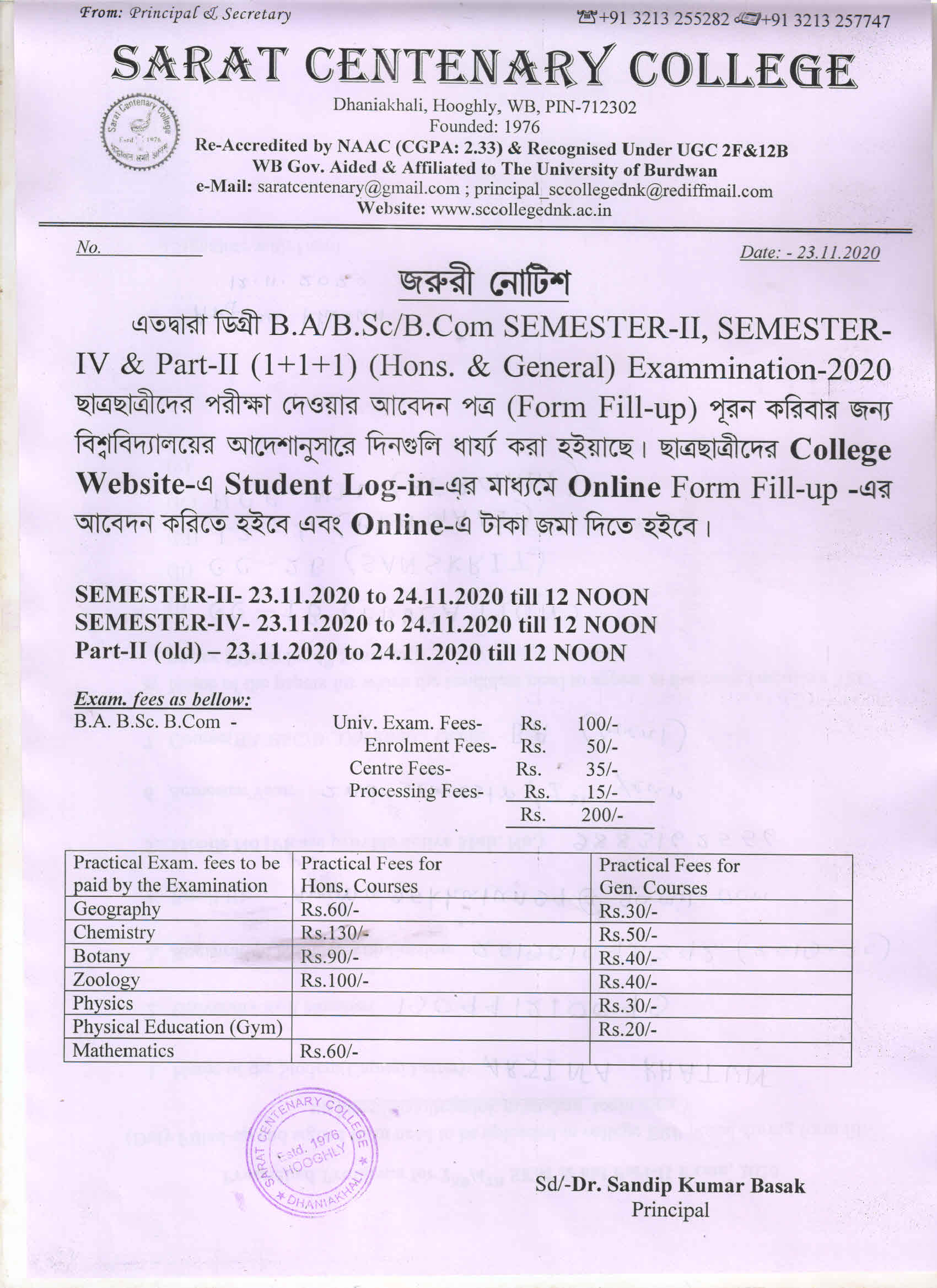 Notice for BA/ BSc/ BCom (Honours & General) Part-I (Casual) Form fill up