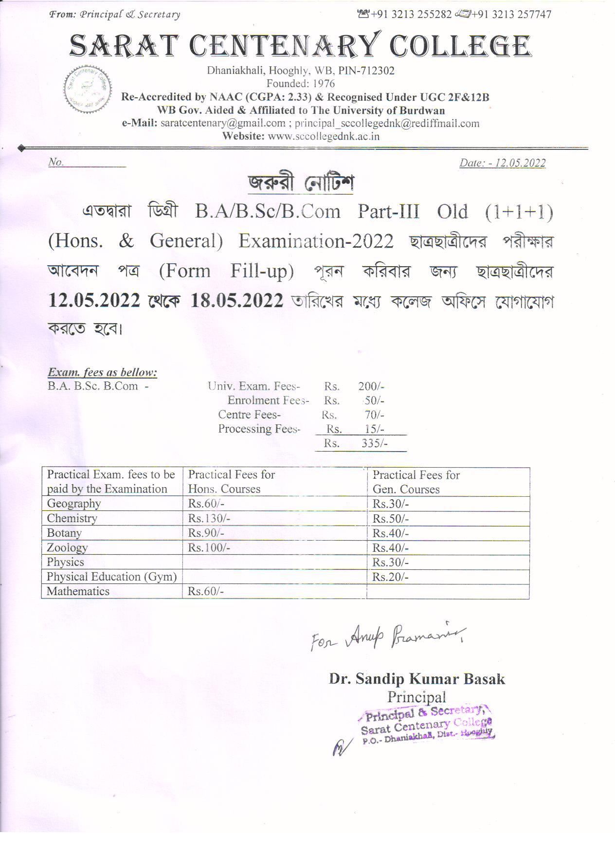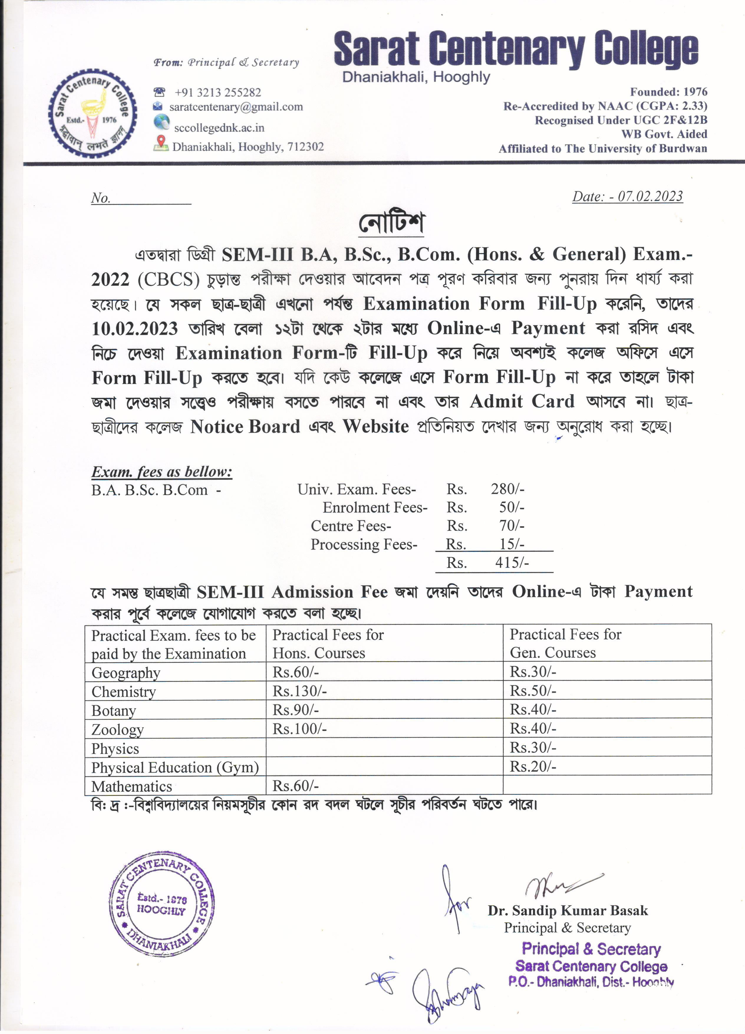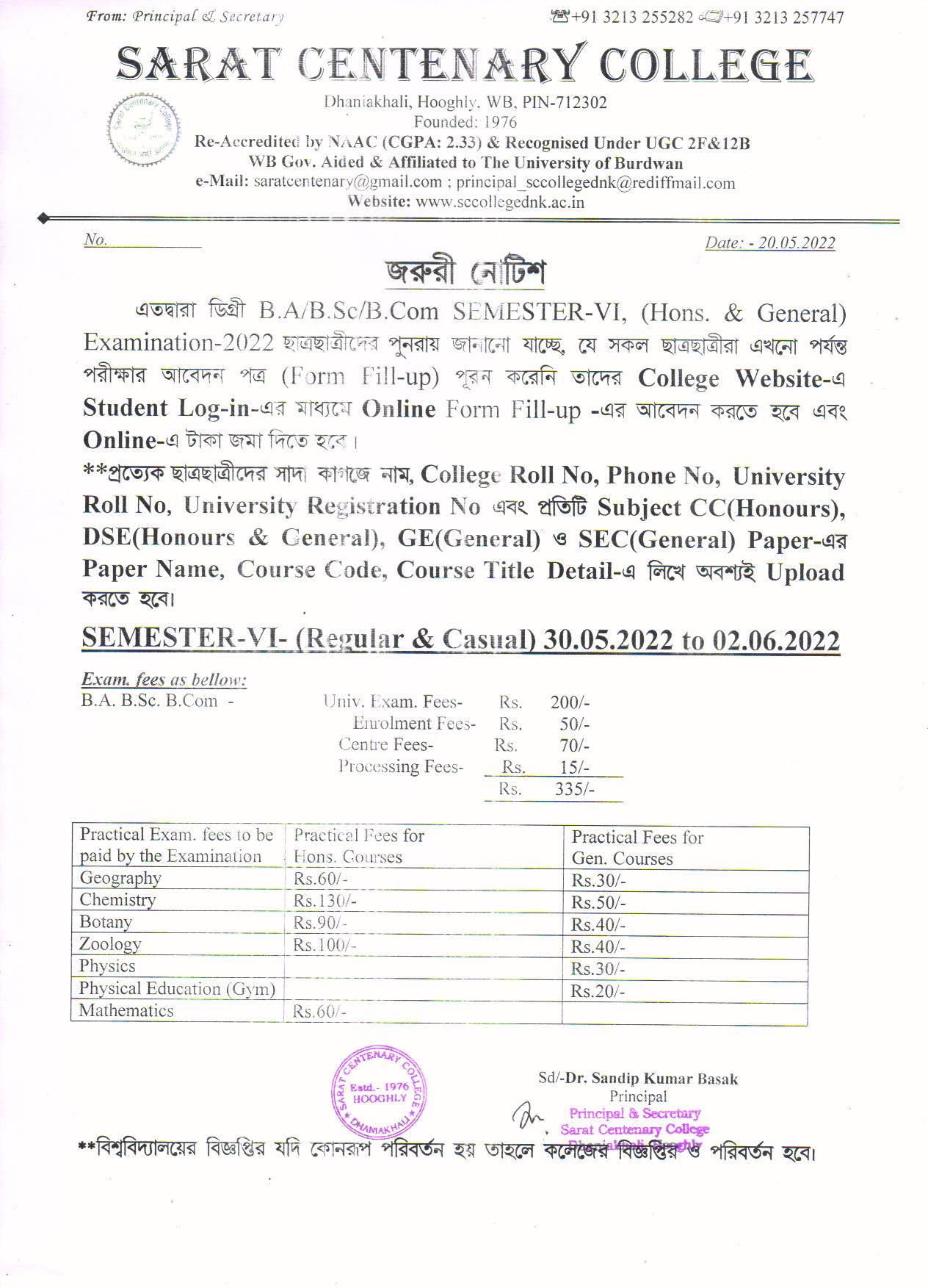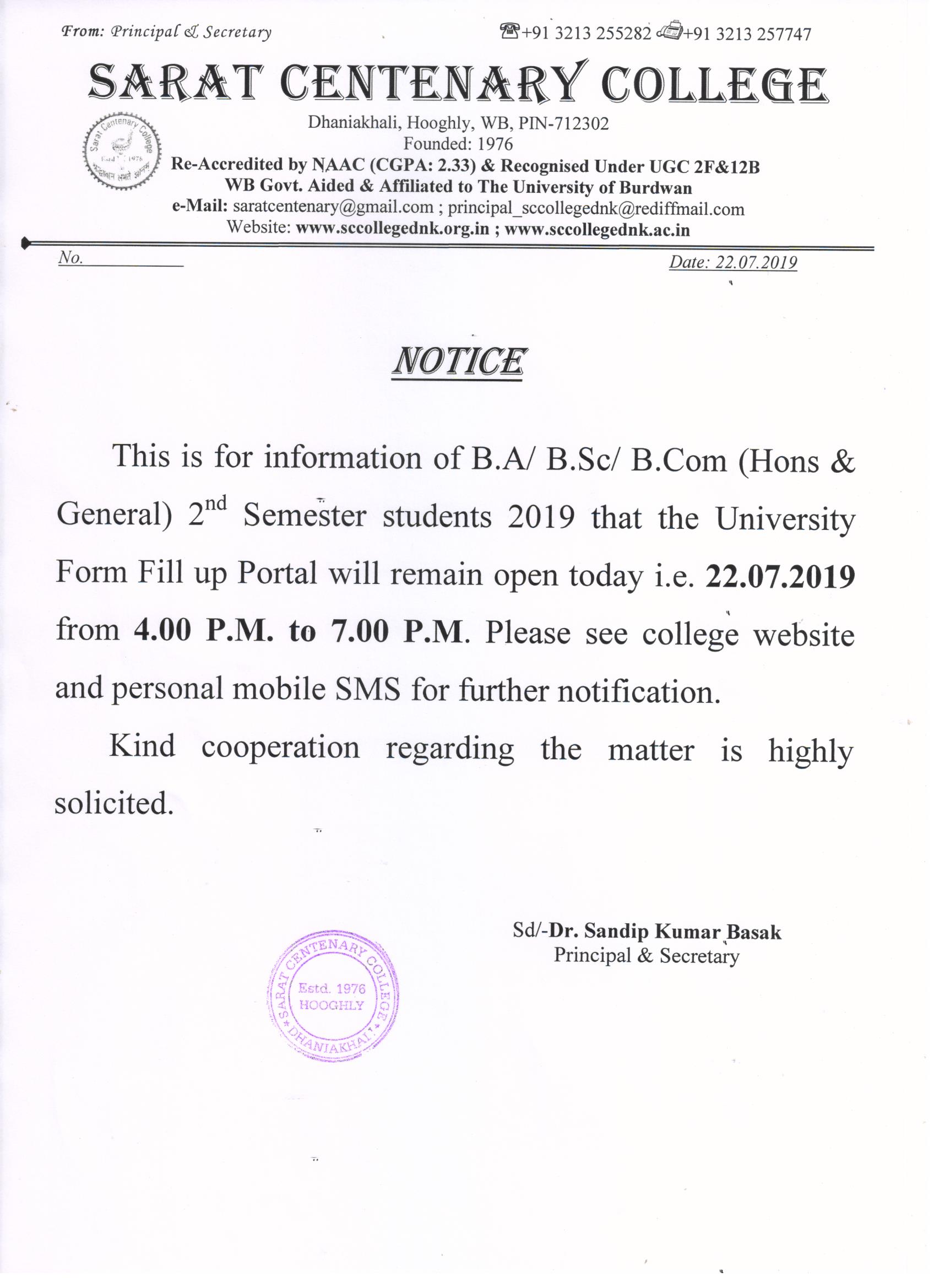 Notice for BA/ BSc/ BCom (Honours & General) Part-I (Casual) Form fill up