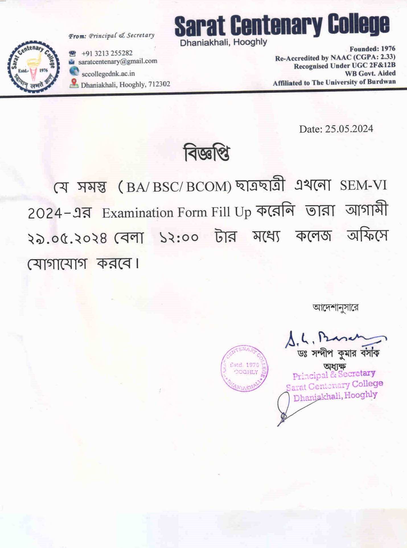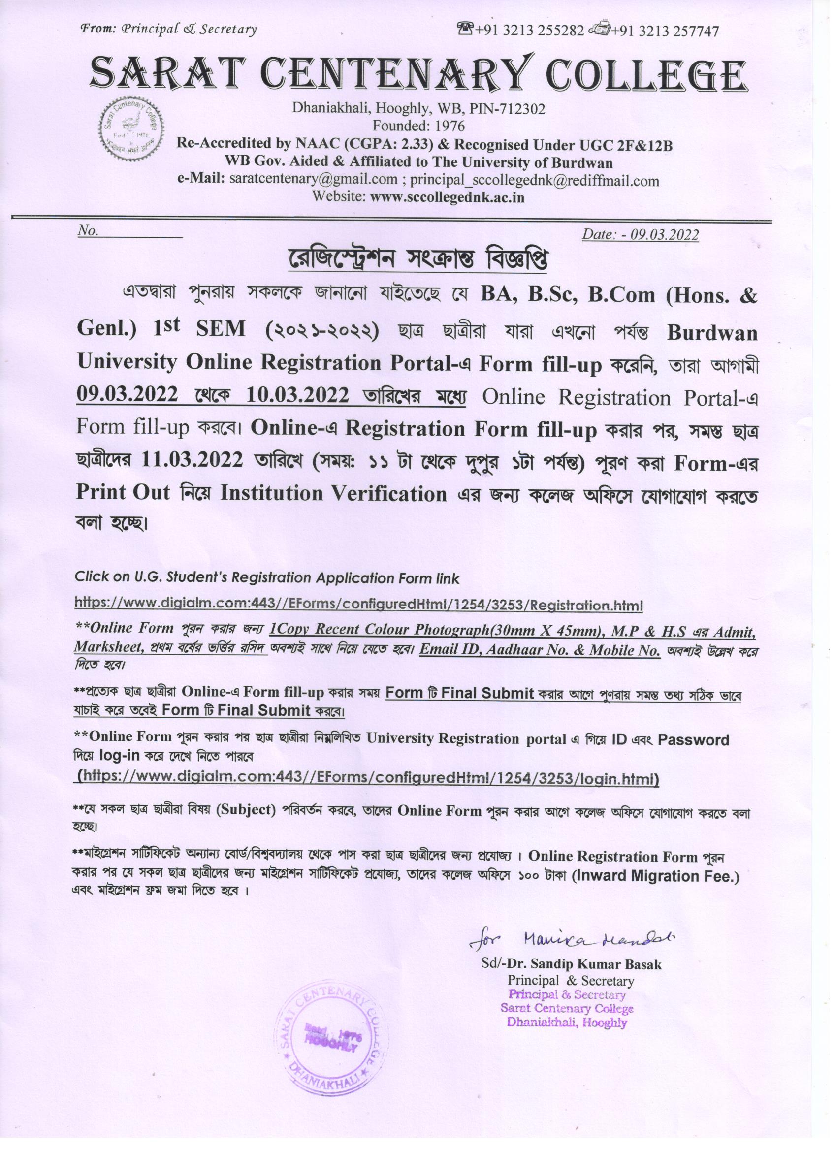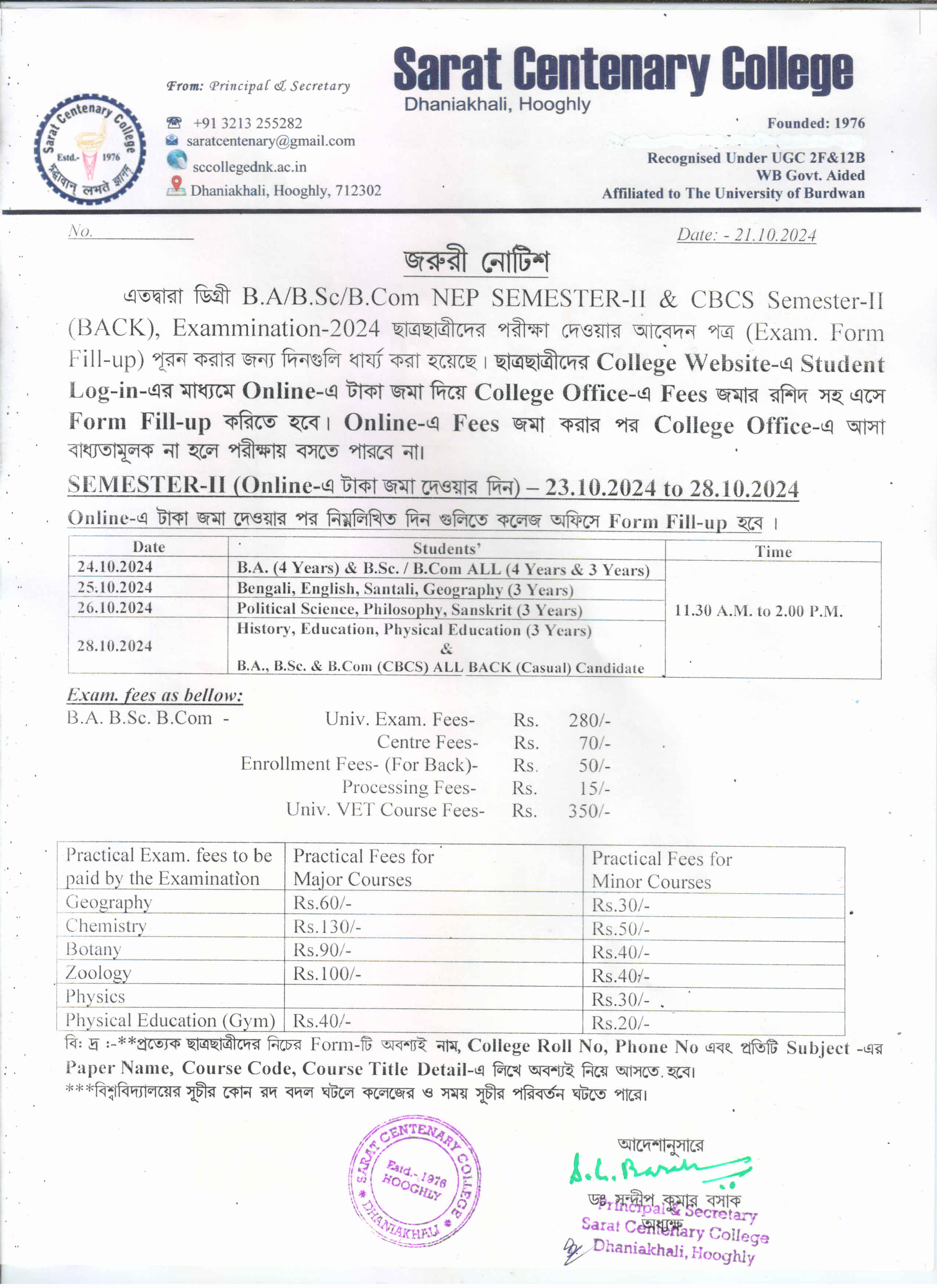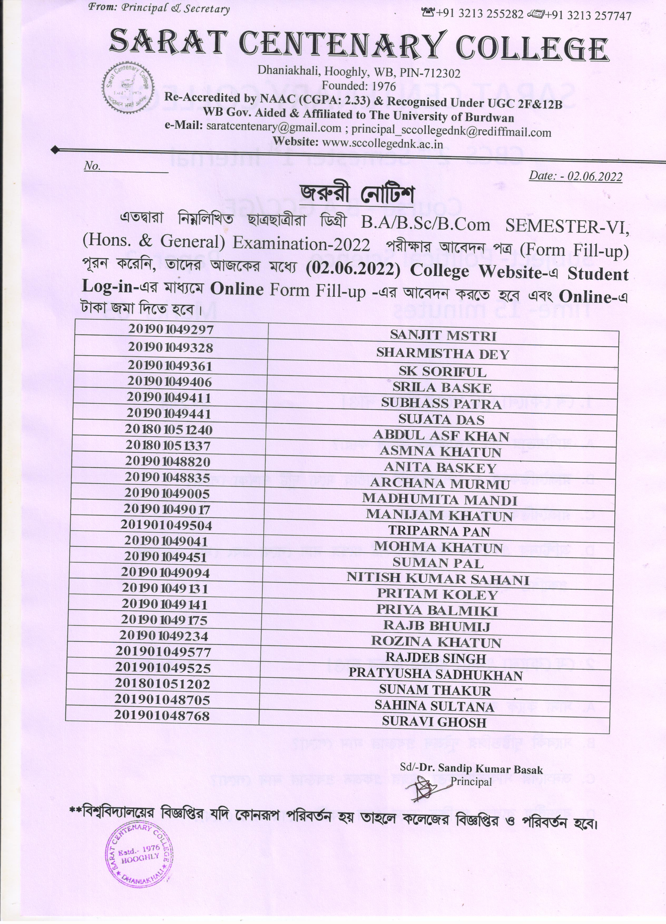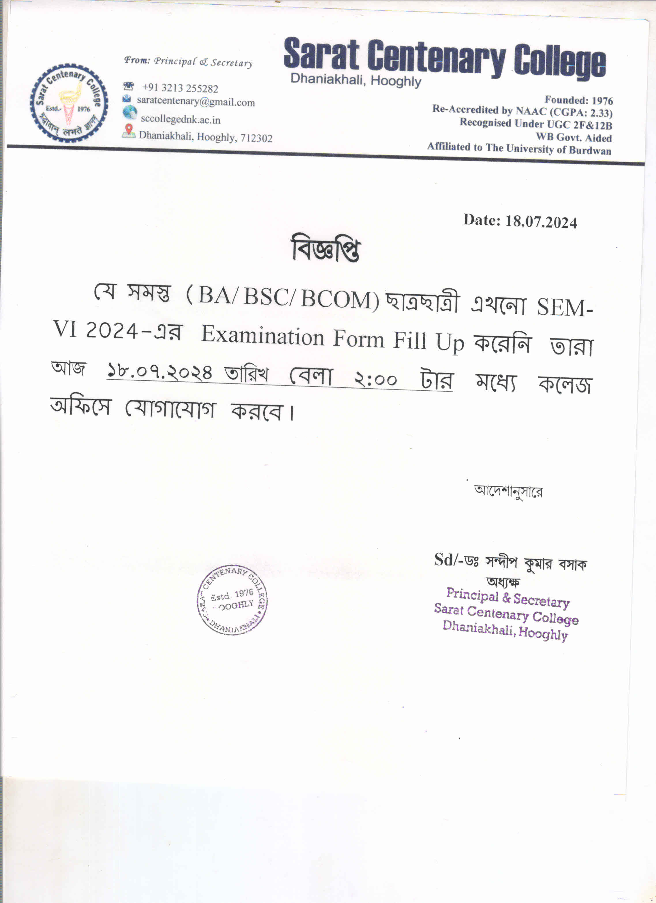 Notice for BA/ BSc/ BCom (Honours & General) Part-I (Casual) Form fill up
