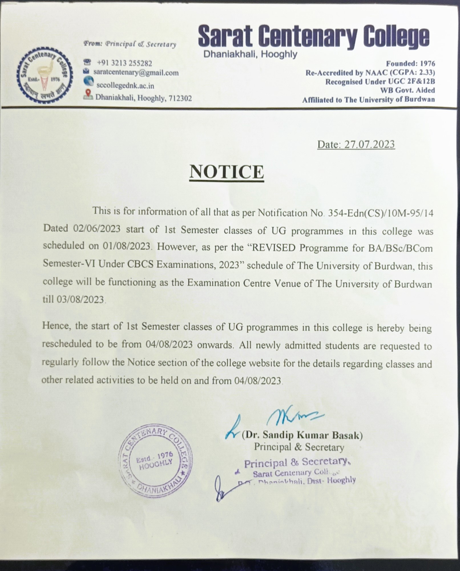 Commencement of Classes for SEM-I