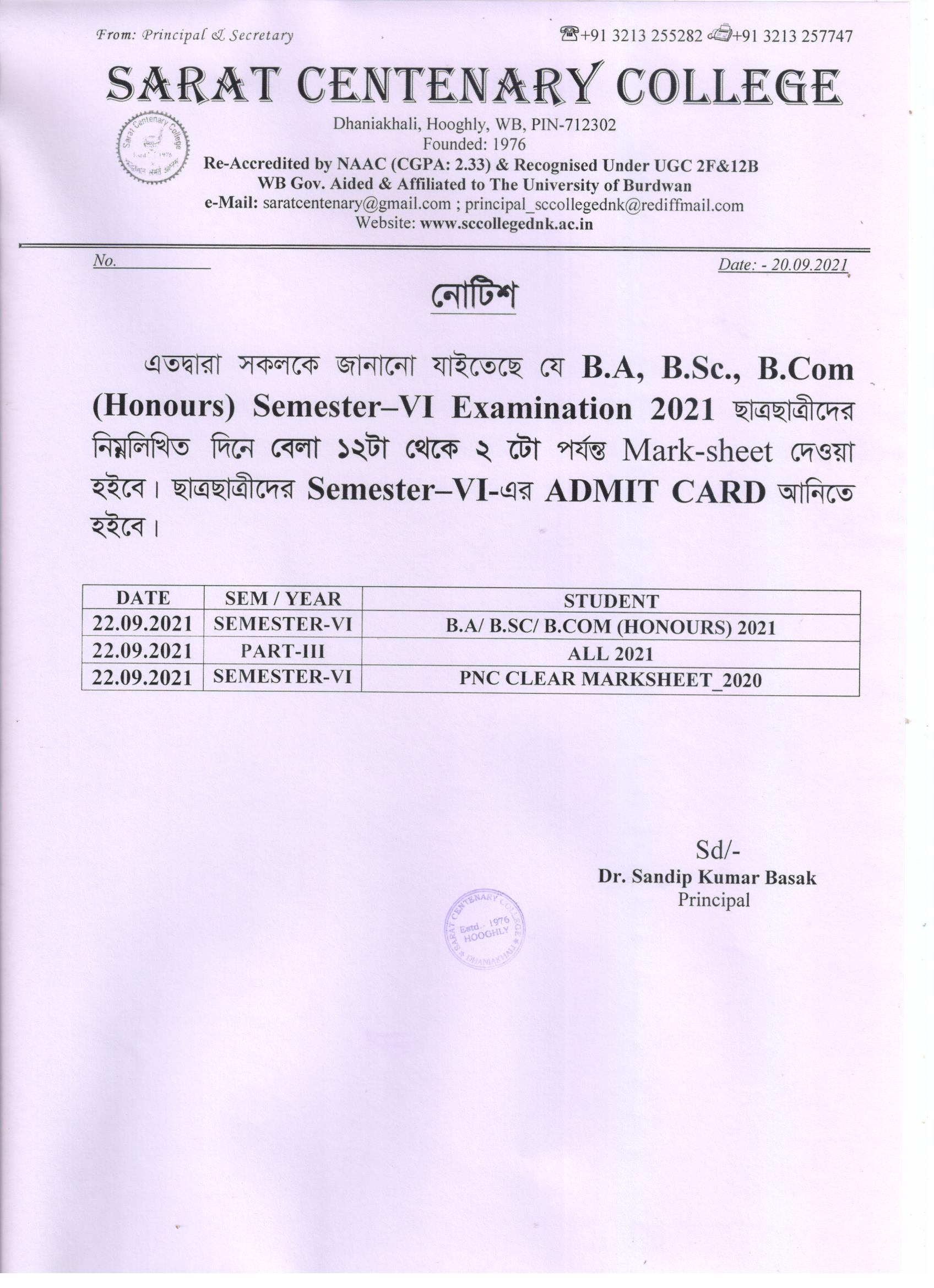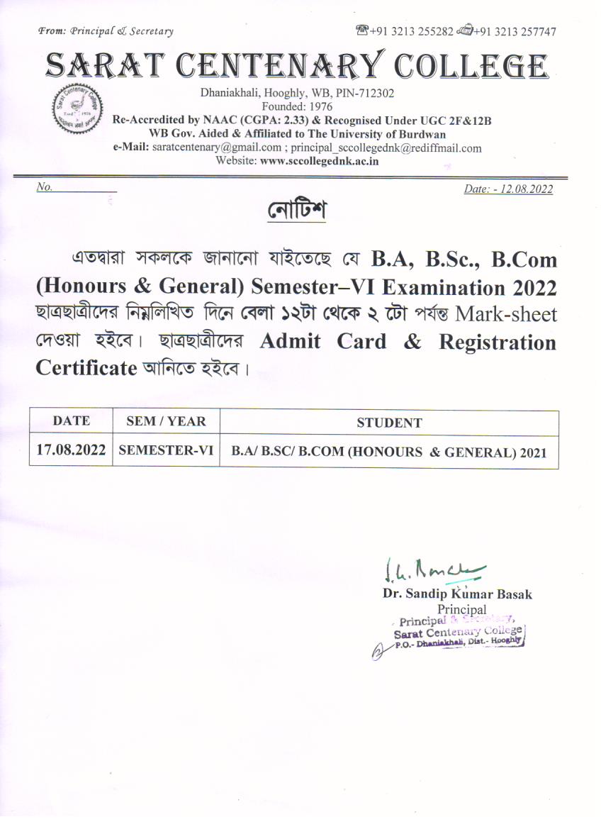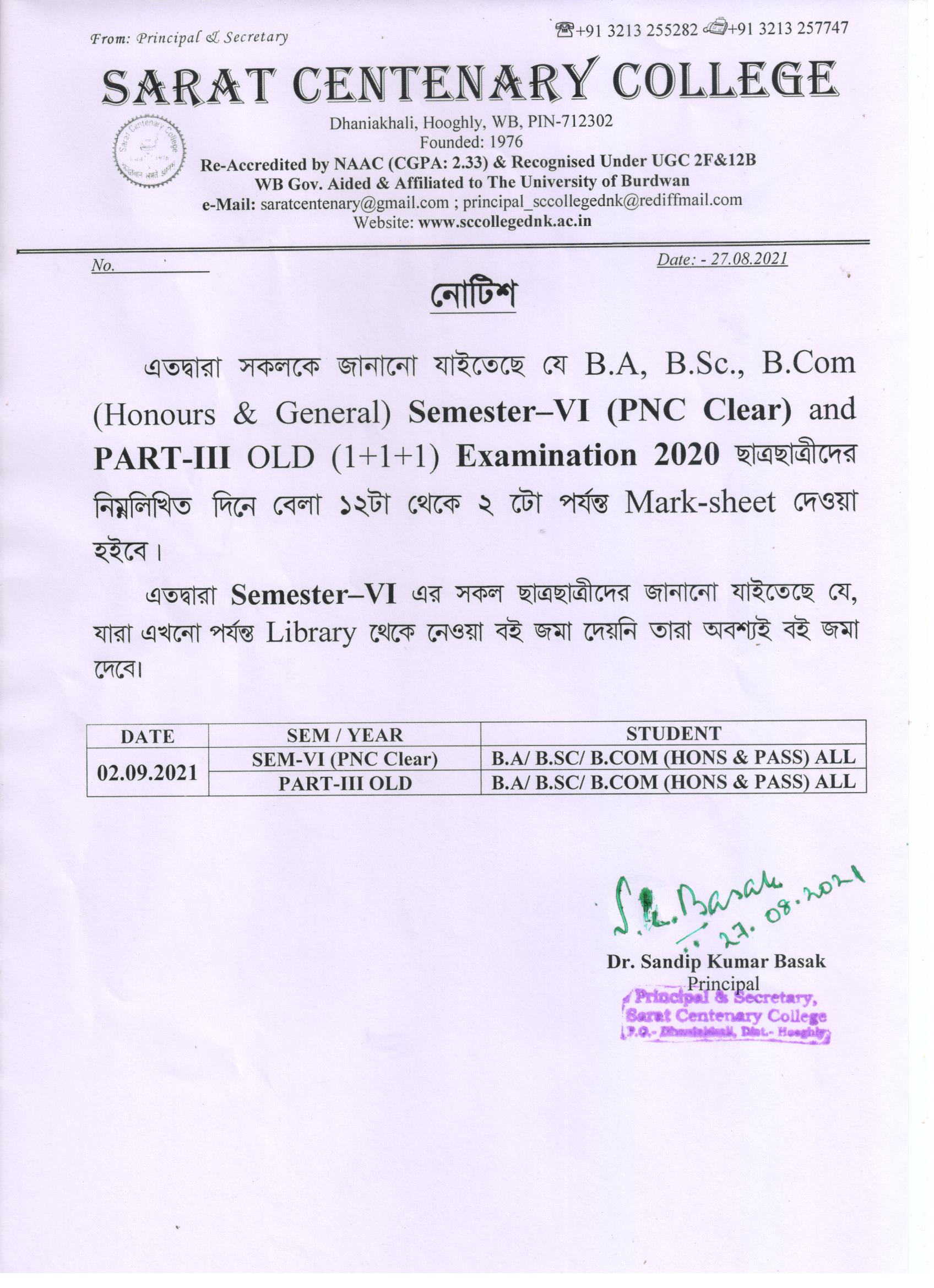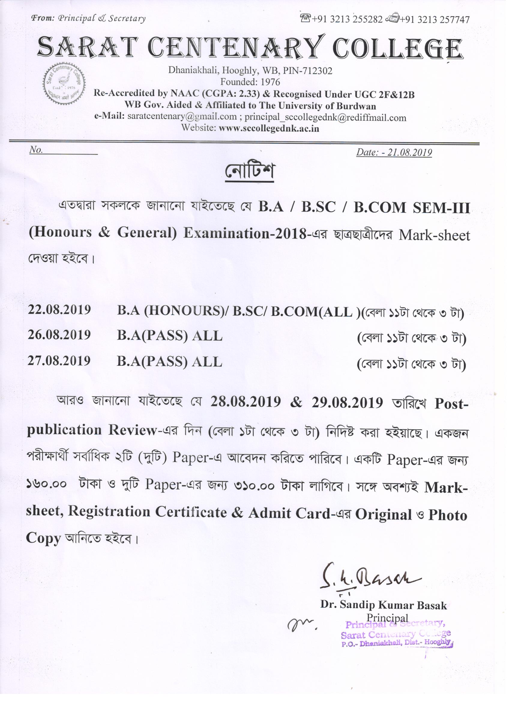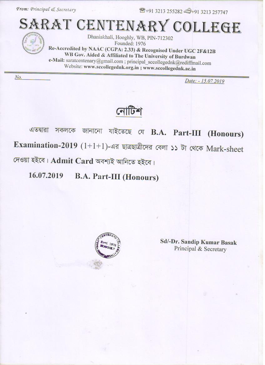 Ba/BSc/BCom (Honours) Part-III Marksheet distribution