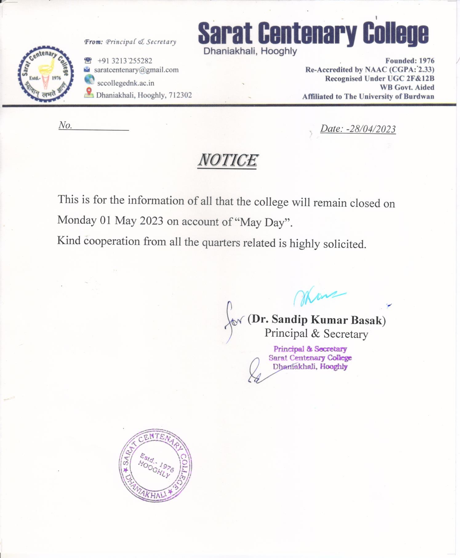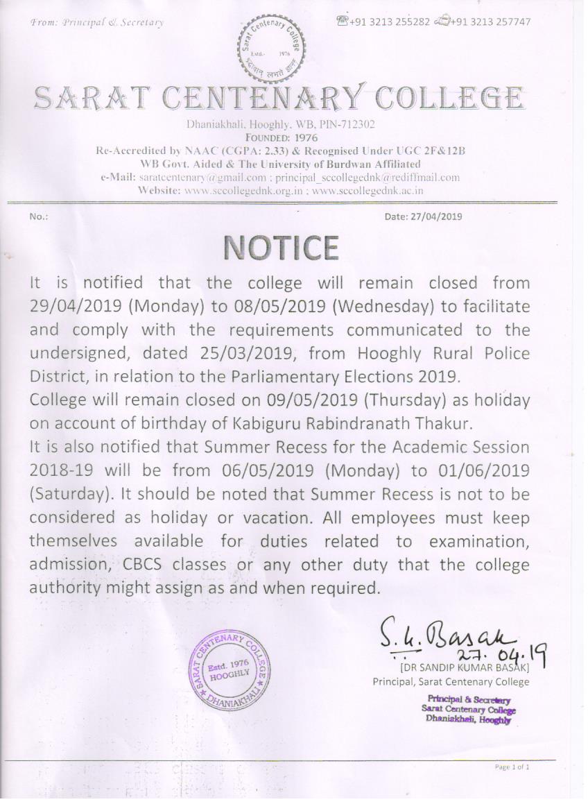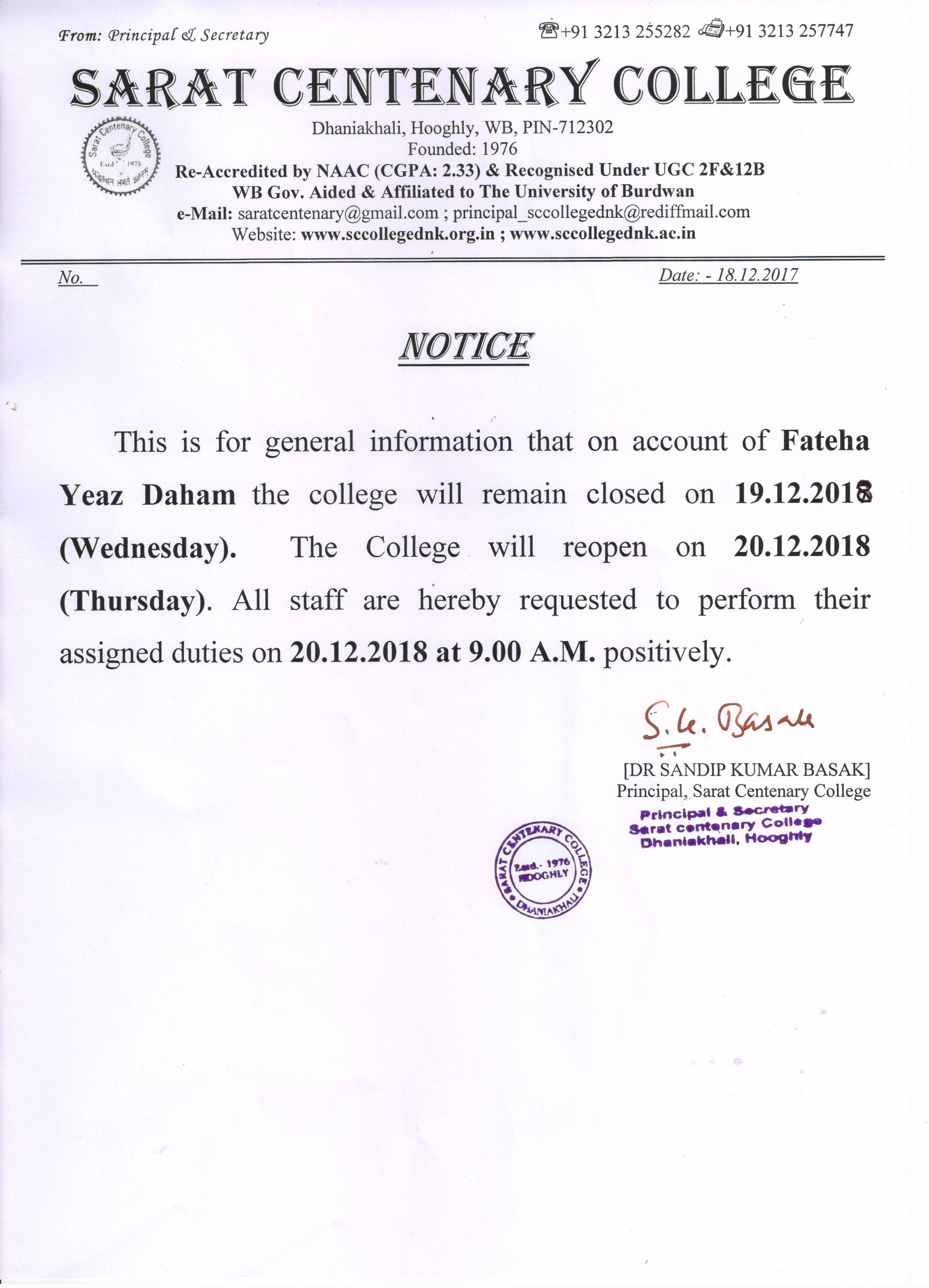 Notice for Holiday on 17 & 18th May 2018