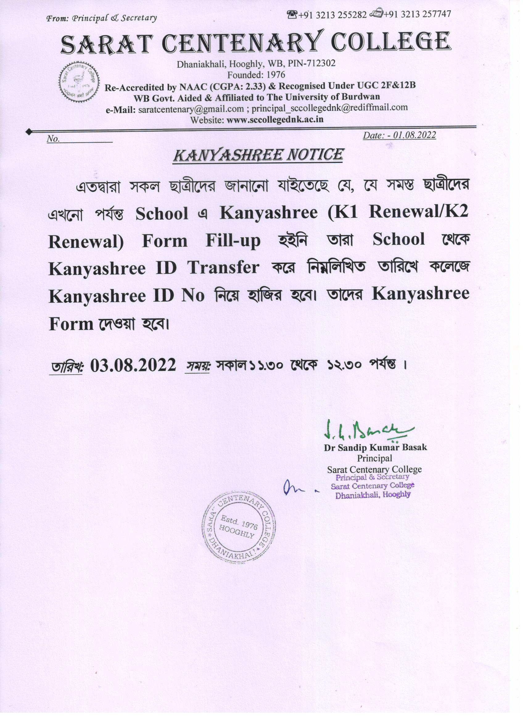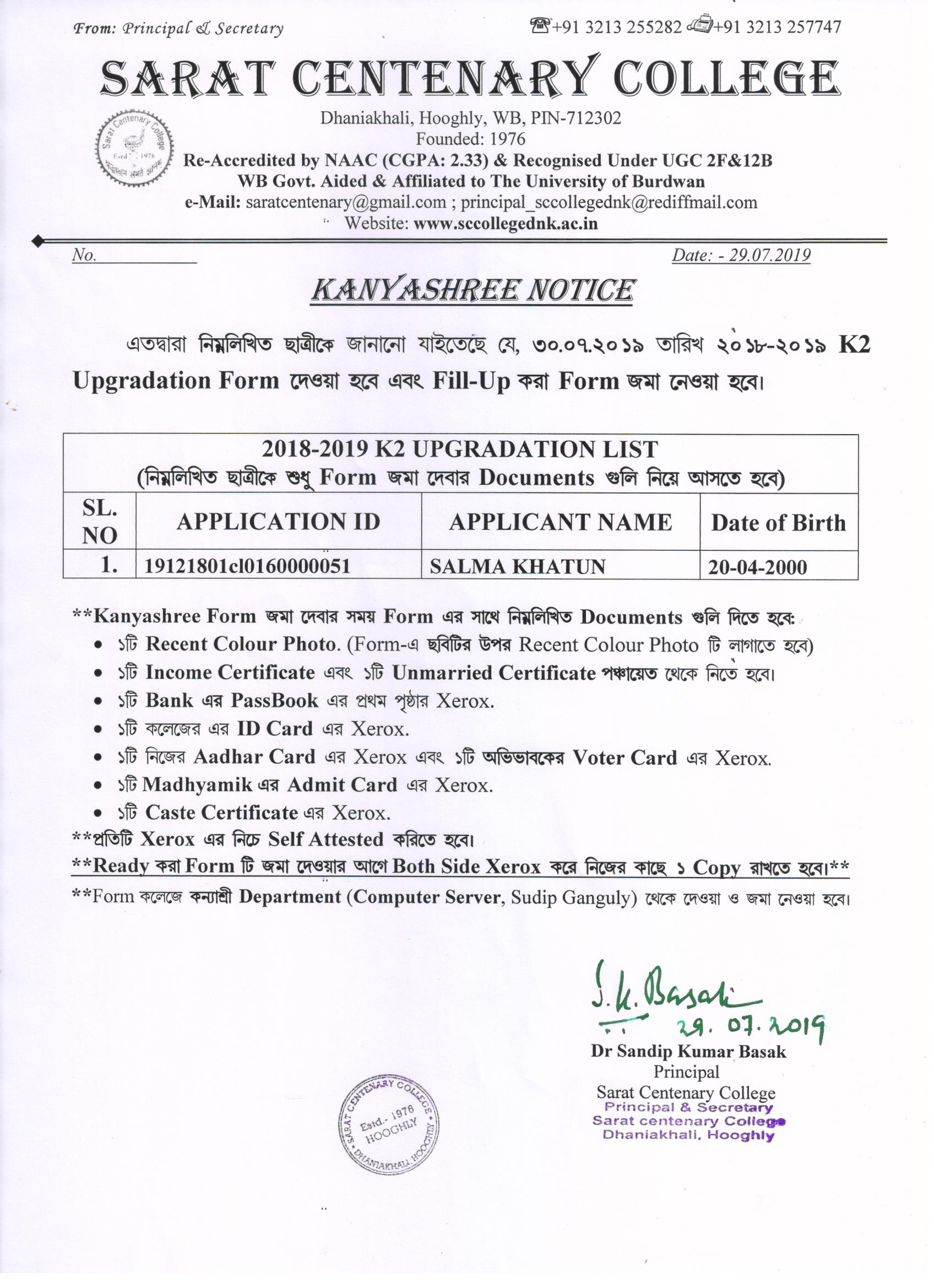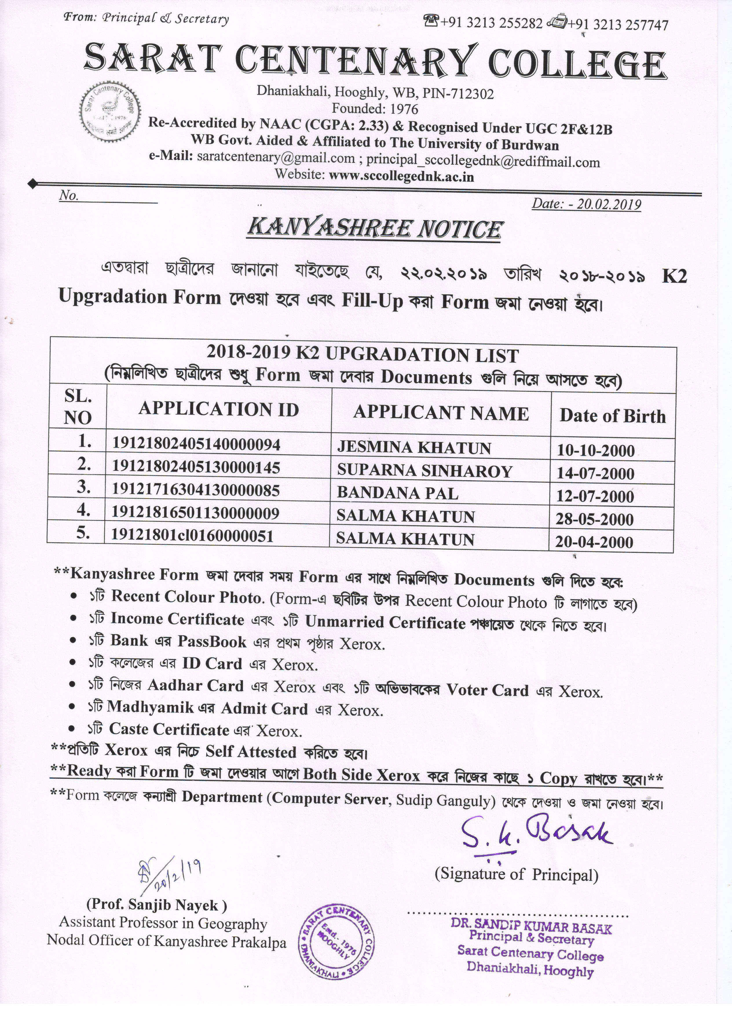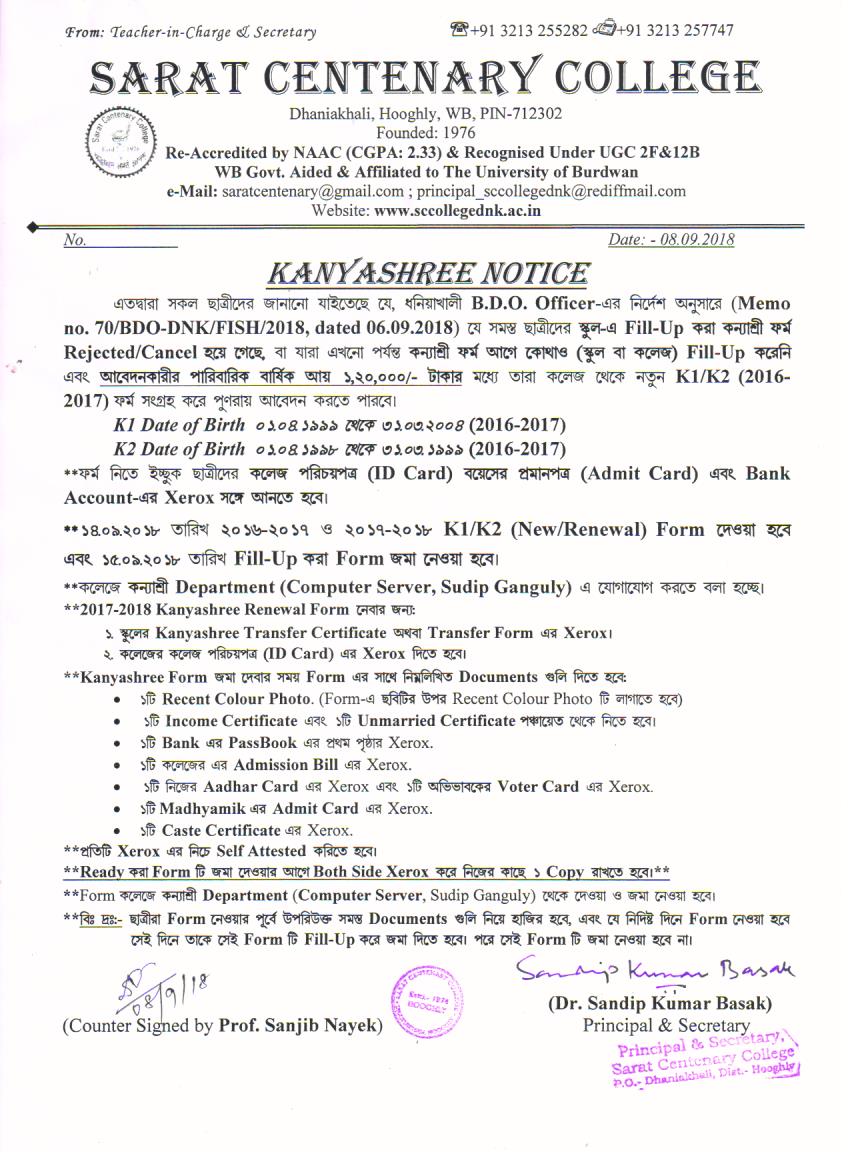 Kanyashree Notice for K2 Upgradation Form Fillup 2017-18